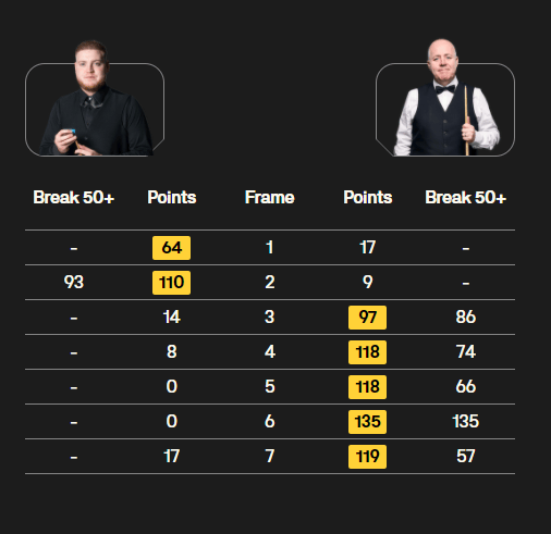全场比赛,希金斯打出一杆破百(135)和四杆50+(86、74、66、50),希斯科特打出一杆50+(93)。