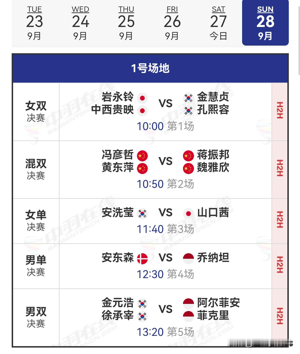 28日赛程2025年韩国羽毛球公开赛 9月28日,韩国羽毛球公开赛进入决赛,于北京时间10点开赛。国羽提前锁定混双冠亚军。 首场比赛是女双,来自于韩国的金慧贞:孔熙容和以日本的岩永铃/中西贵映。,双方之前仅交手过一次,在今年的新加坡公开赛决赛,当时是金慧贞/孔熙容以2:0战胜了对手。 第2场比赛是混双,来自中国队的冯彦哲/黄东萍与蒋振邦/魏雅欣,双方算是老对手了,在国际比赛交手过13次,凤凰组合11胜2负占优。 第3场比赛是女单,韩国的安洗莹对阵日本的山口茜,双方从2019年首次相遇起,到目前为止已经交手过28次,交手记录为14:14。安洗莹在今年三次的交手中,全部以2:0轻松拿下小马达。 第4场是男单,由丹麦的安东森对阵印尼的乔纳坦。这次比赛是今年他们的首次交手,此前11次交手中,乔纳坦六胜五负略微占优,最近安东森已取得两连胜。 最后出场的是男双,由韩国金元浩/徐承宰对阵印尼的阿尔菲安/菲克里。双方都是重新配对的组合,仅在今年交手过两次,各取得一场胜利。