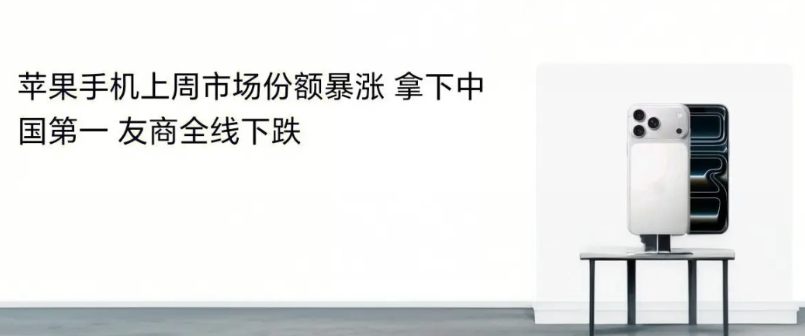 苹果iPhone17发布之后一直维持着国产手机厂家基本上没好日子过的观点。虽然首批购买iPhone 17的用户从体验上遇到各种各样的麻烦和功能上的困扰,但依旧不妨碍iPhone 17的热卖。 果不其然,有市场调研机构的数据证实苹果手机上周销量暴涨,成功拿下国内市场第一的宝座。其他手机品牌全线下跌,哪怕有个手机大厂采取临时更改手机名和全球首发高通骁龙最新处理器,并宣称销量突破预期也未能幸免。