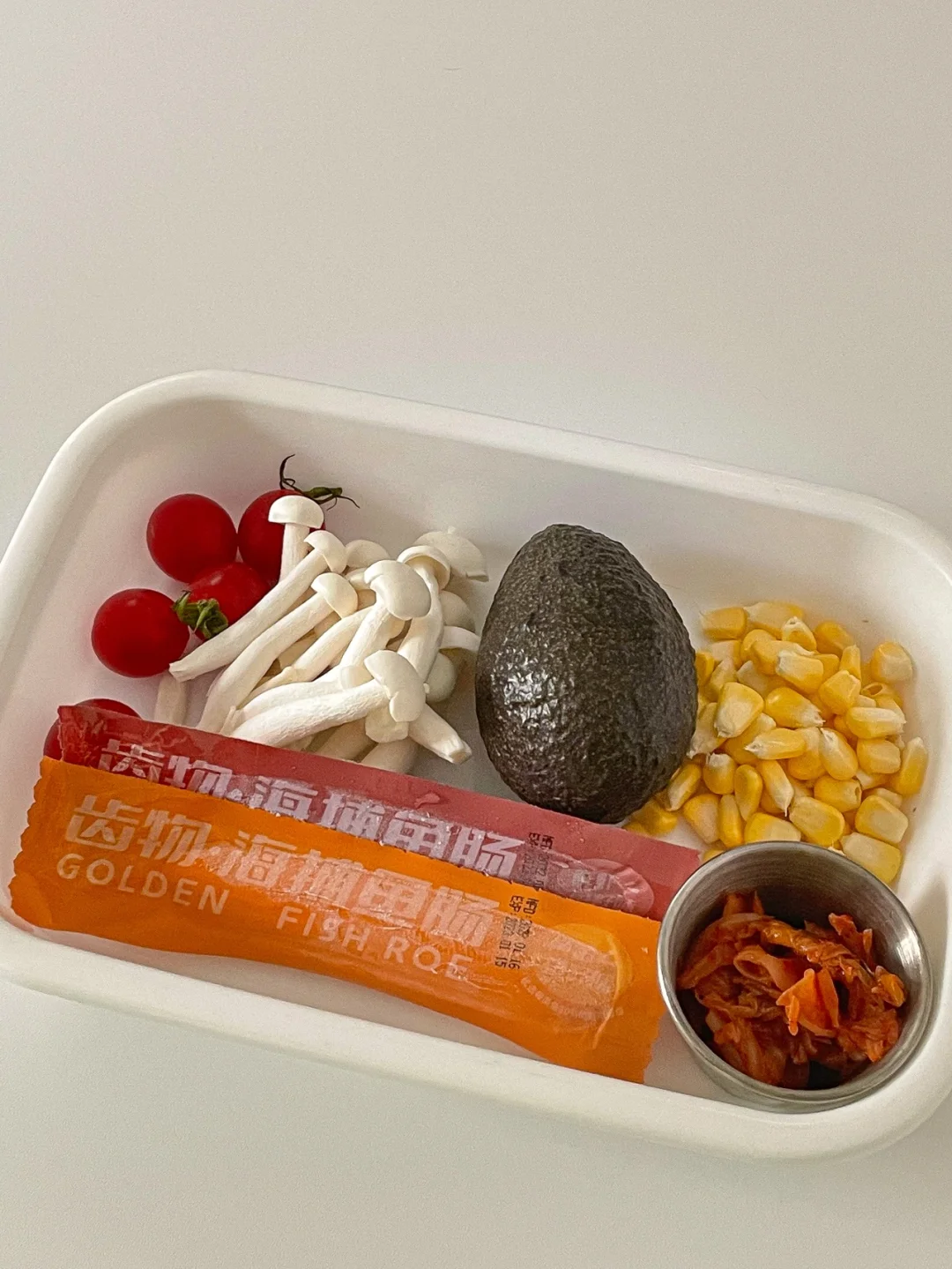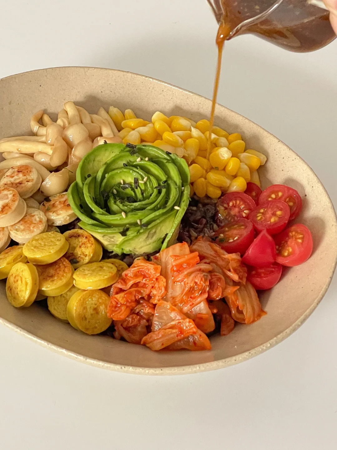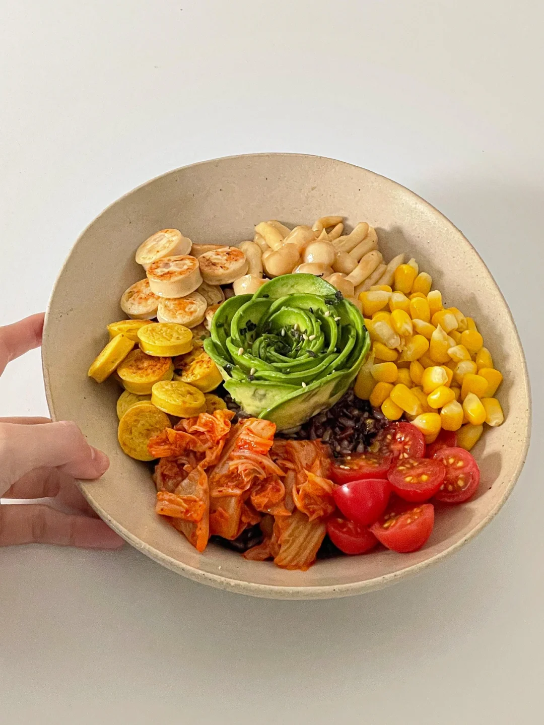 杂粮饭 鱼肠 牛油果 泡菜 玉米 小番茄 海鲜菇 (任何自己喜欢的蔬菜都可以 )