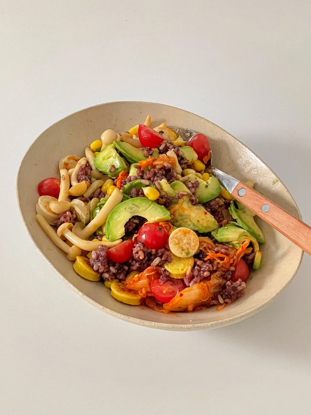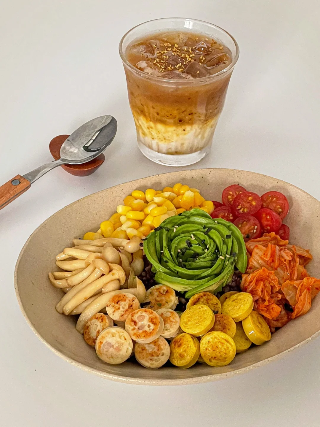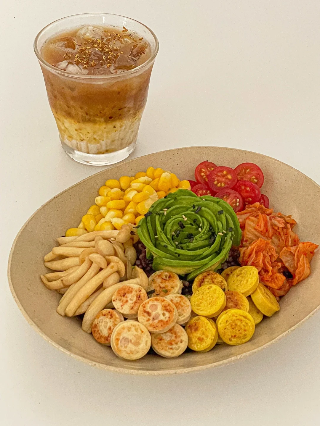 杂粮饭 鱼肠 牛油果 泡菜 玉米 小番茄 海鲜菇 (任何自己喜欢的蔬菜都可以 )