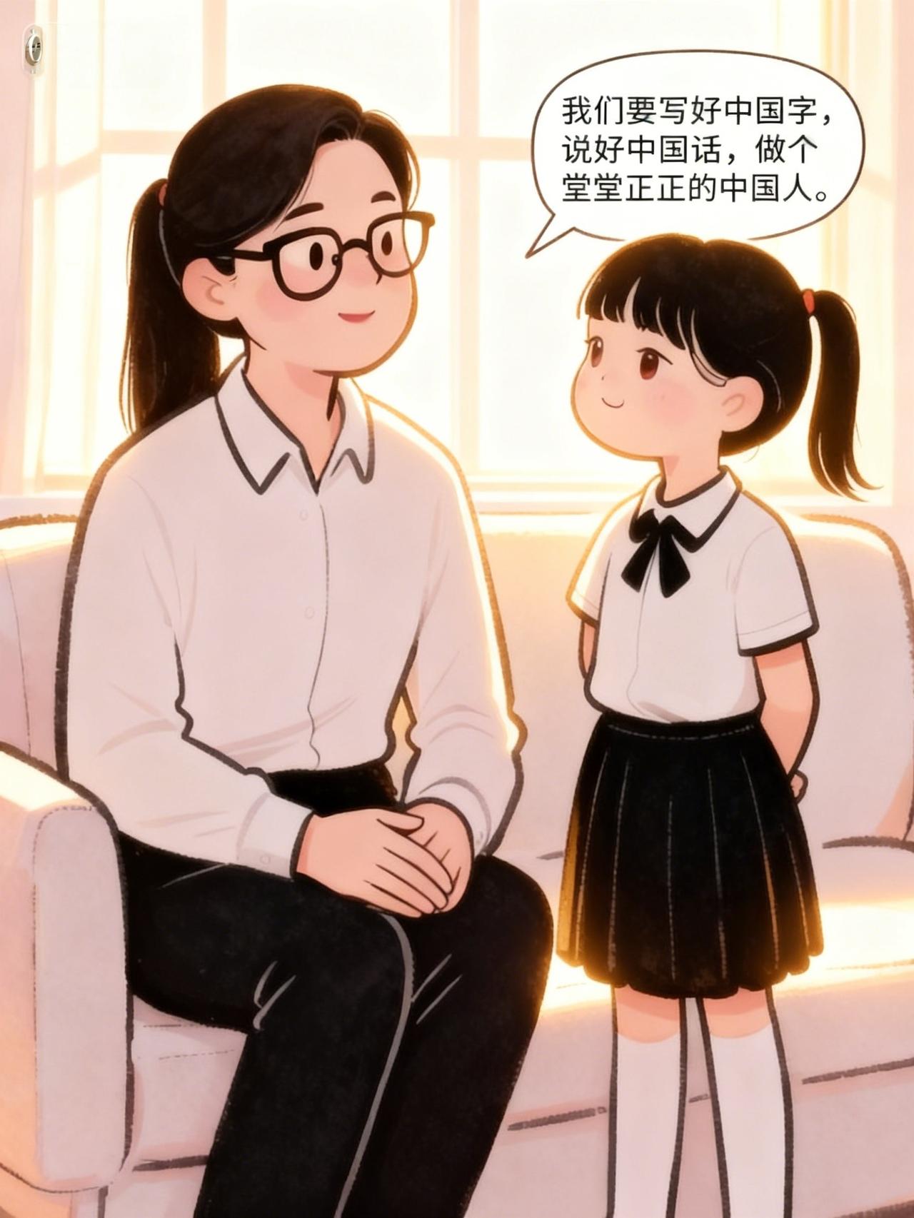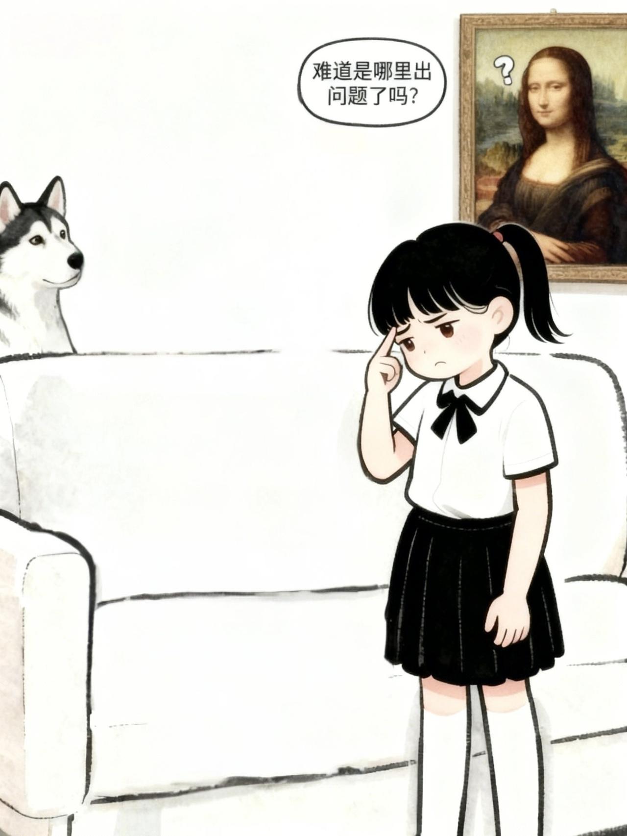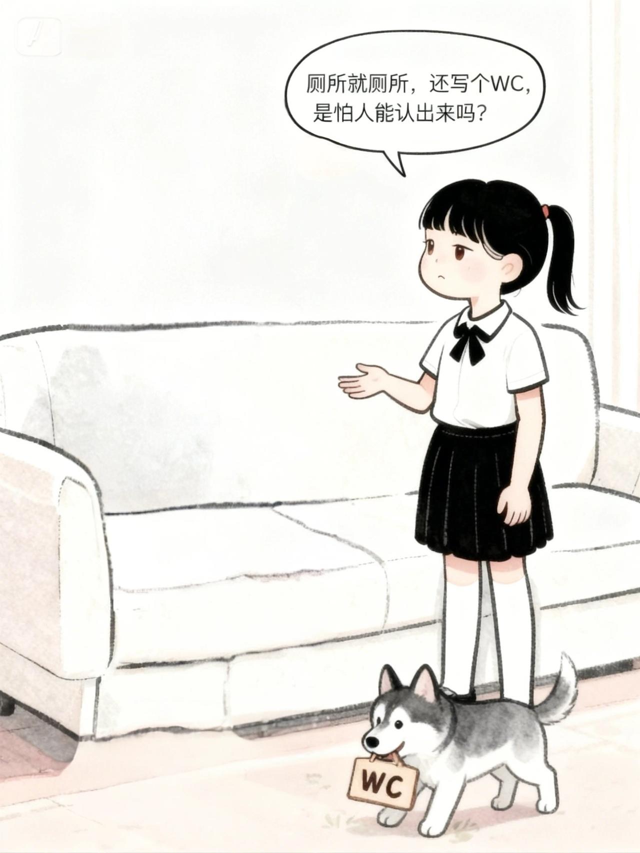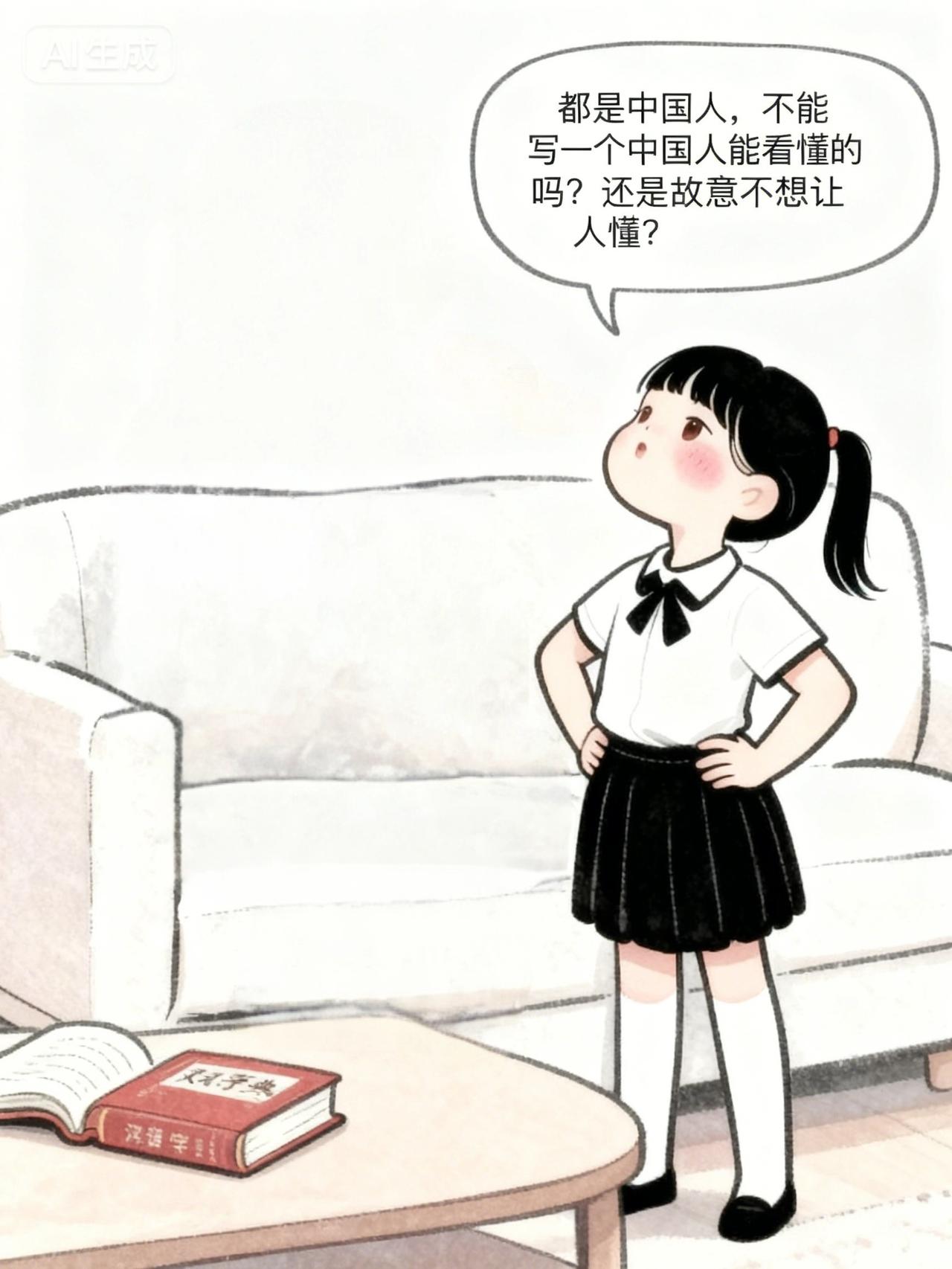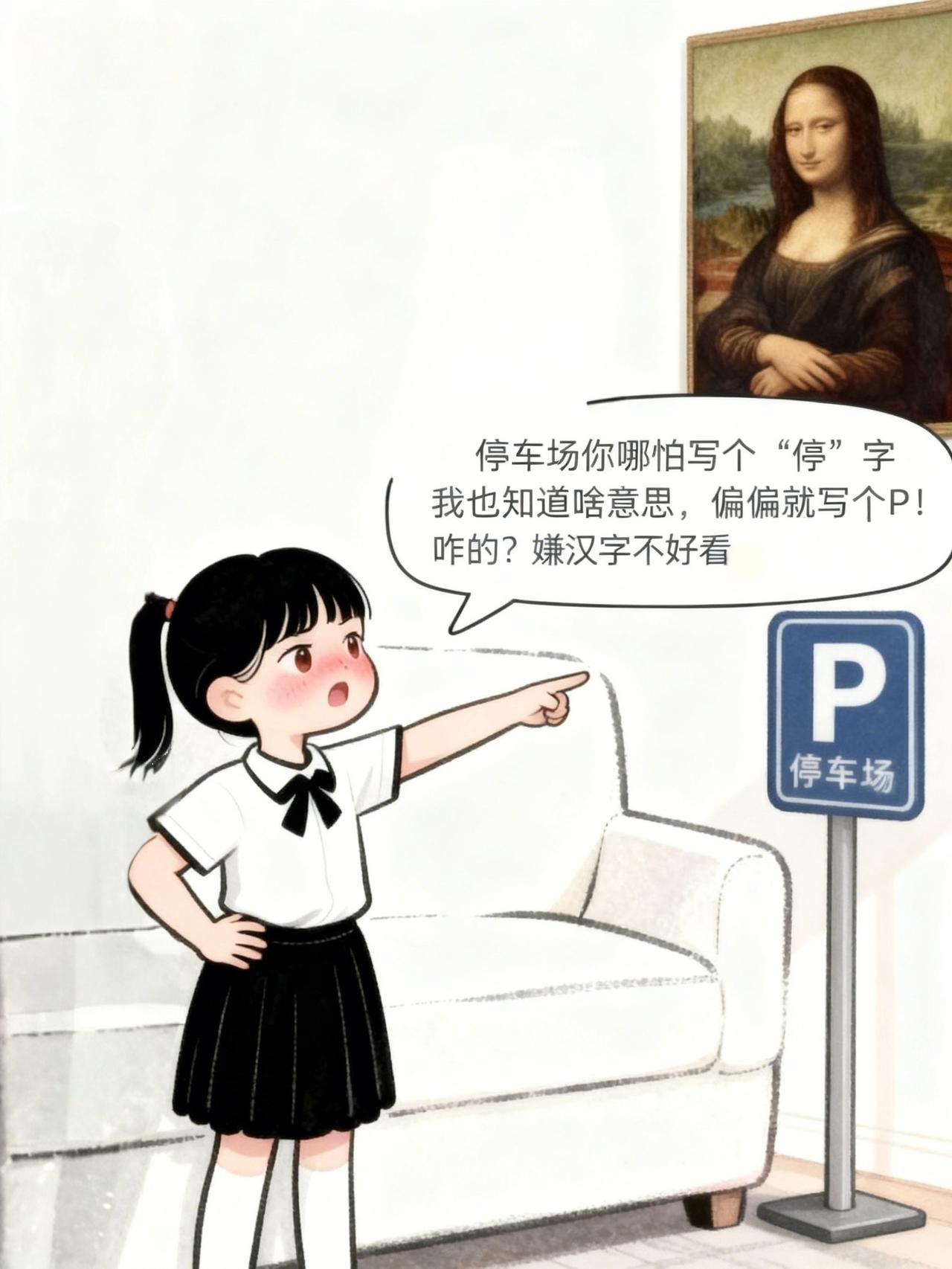 小女孩双手叉腰,满脸困惑地向14亿中国人发出质问:"谁能用汉语给我讲讲AI是啥意思?CCTV是什么意思?GPS是什么意思?KTV是什么意思?YYDS又是什么意思?" 小女孩越说越激动:"停车场你哪怕写个'停'字我也知道啥意思,偏偏就写个P!咋的?嫌汉字不好看,还是嫌汉字太难写?"小脸气得通红,"都是中国人,不能写一个中国人能看懂的吗?还是故意不想让人懂?" 接着又拿厕所举例:"厕所就厕所,还写个WC,是怕人能认出来吗?"语气里满是无奈和不解。 突然,女孩平静下来,用稚嫩的声音复述老师的教导:"我们要写好中国字,说好中国话,做个堂堂正正的中国人。"然后歪着头,露出困惑的表情:"难道是哪里出问题了吗?" 背景里,一只哈士奇在沙发上咧嘴笑着,墙上的恶搞版蒙娜丽莎画像仿佛也在见证这场关于文化传承的童真拷问。