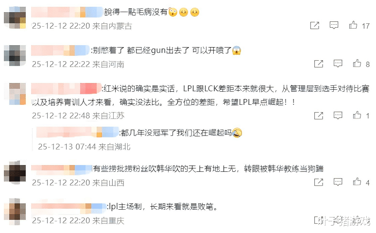 但面对这几年LPL的外战成绩,不少人也陷入到深深的怀疑中:“红米说的确实是实话,LPL跟LCK差距本来就很大,从管理层到选手对待比赛以及培养青训人才来看,确实没法比。全方位的差距,希望LPL早点崛起!!”,“lpl主场制,长期来看就是败笔”,“韩国电竞非常职业化,中国电竞显得很业余,尤其是LOL,一切以商业为首要目的”……