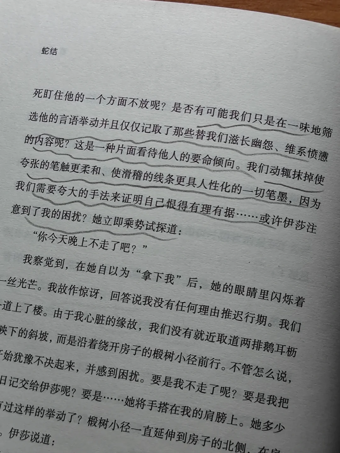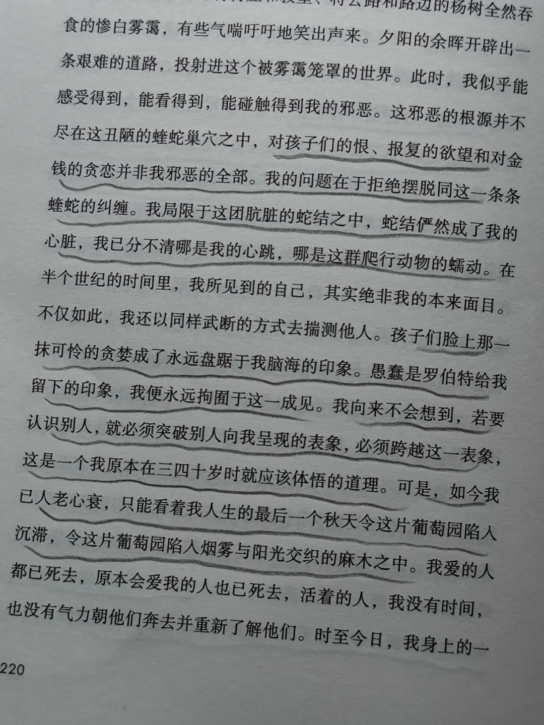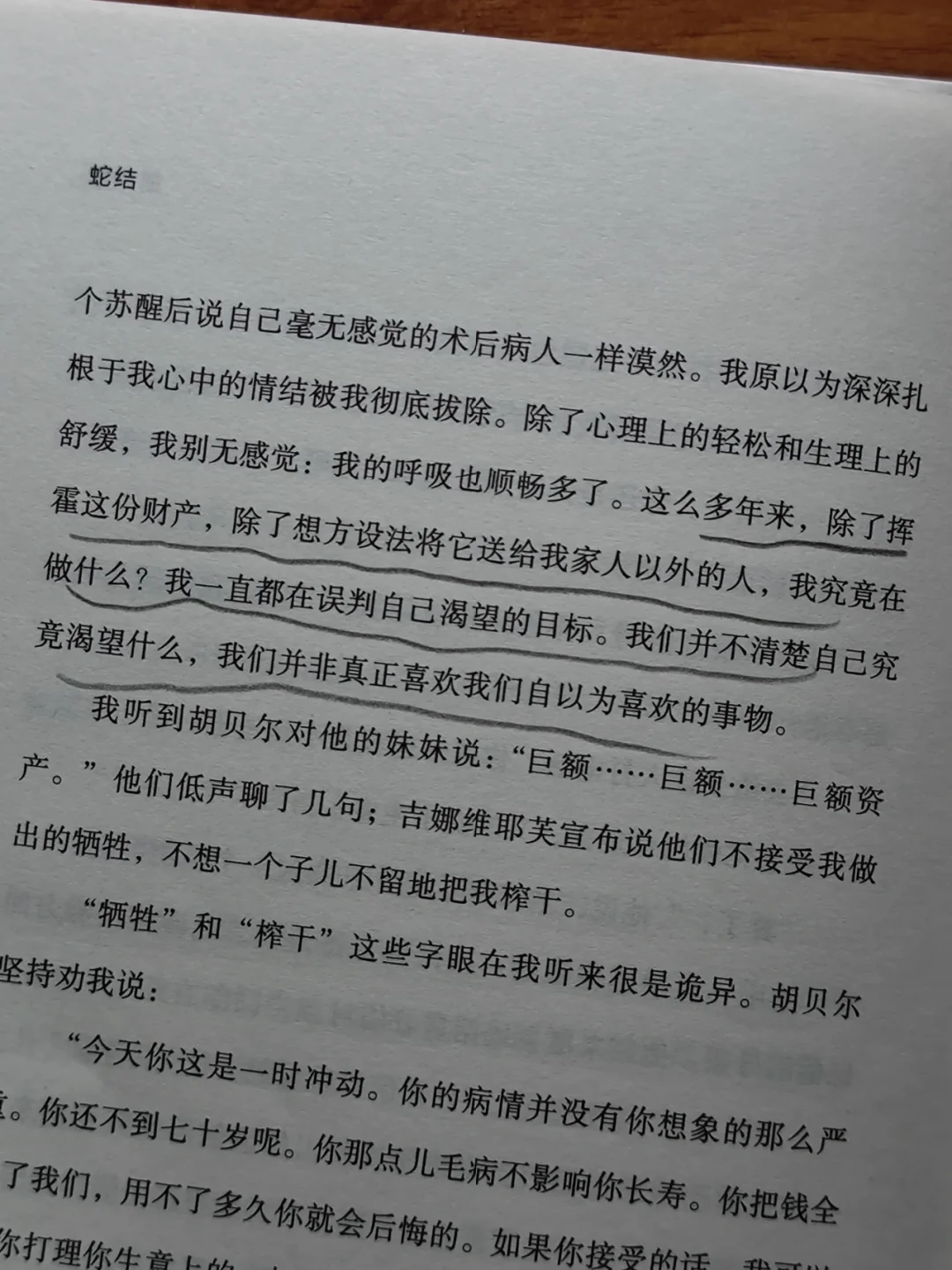《蛇结》的故事全程虐:律师路易,爱情潦草,婚姻惨淡,儿女不称心(唯一喜欢的女儿还因为他不请医生而病逝),他一辈子与家人为敌,妻子说他“眼中只有恶”,一想到死后财产会被留给儿孙,就痛苦不堪,想方设法地挥霍,送给家人以外的人……