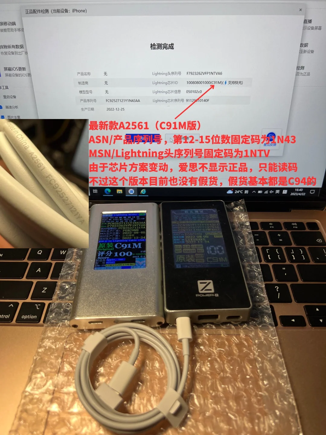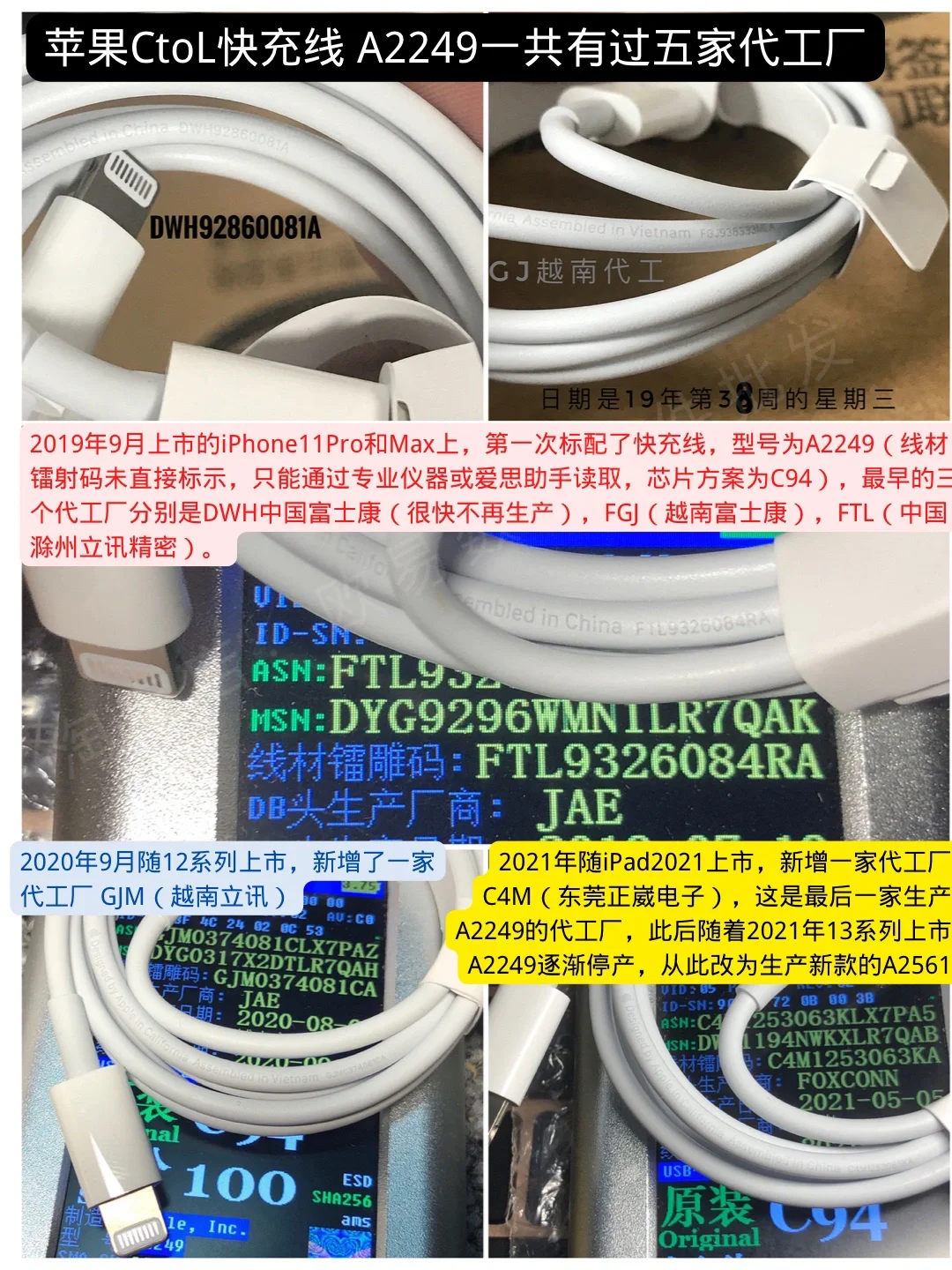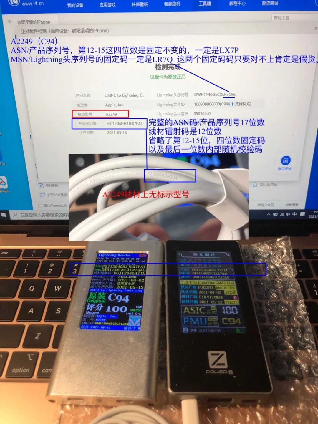 简单介绍一下快充线数量最多的A2249和A2561这两个型号,以及如何通过看是否符合序列号规则来判断真伪。需要特别说一句,符合规则不一定真,但不符合一定假。很多时候即便爱思助手显示为原装,但不符合序列号规则,也是假货