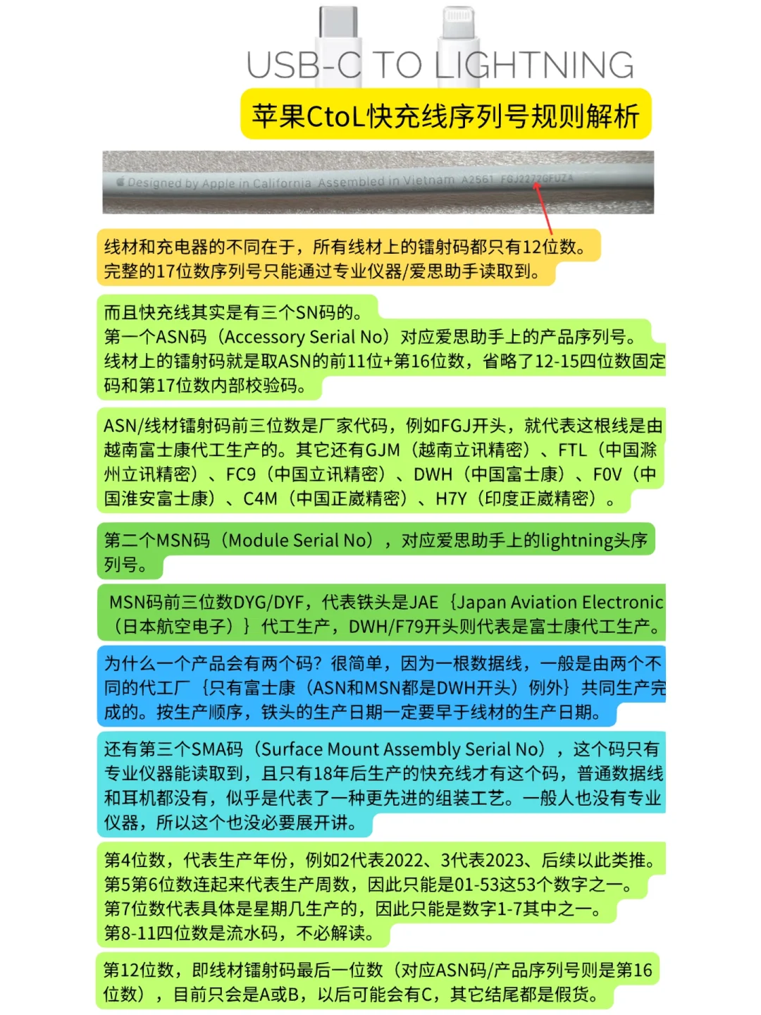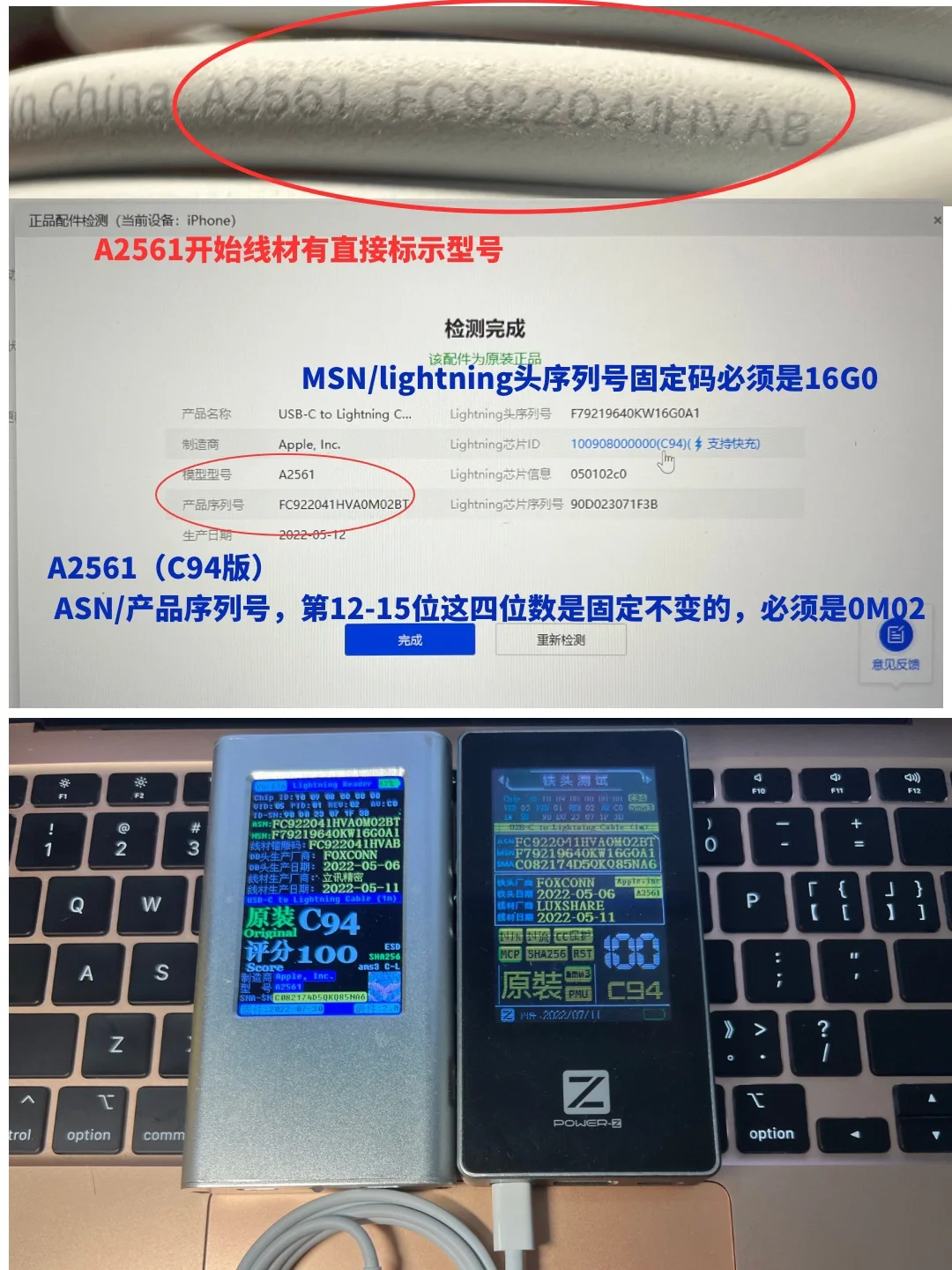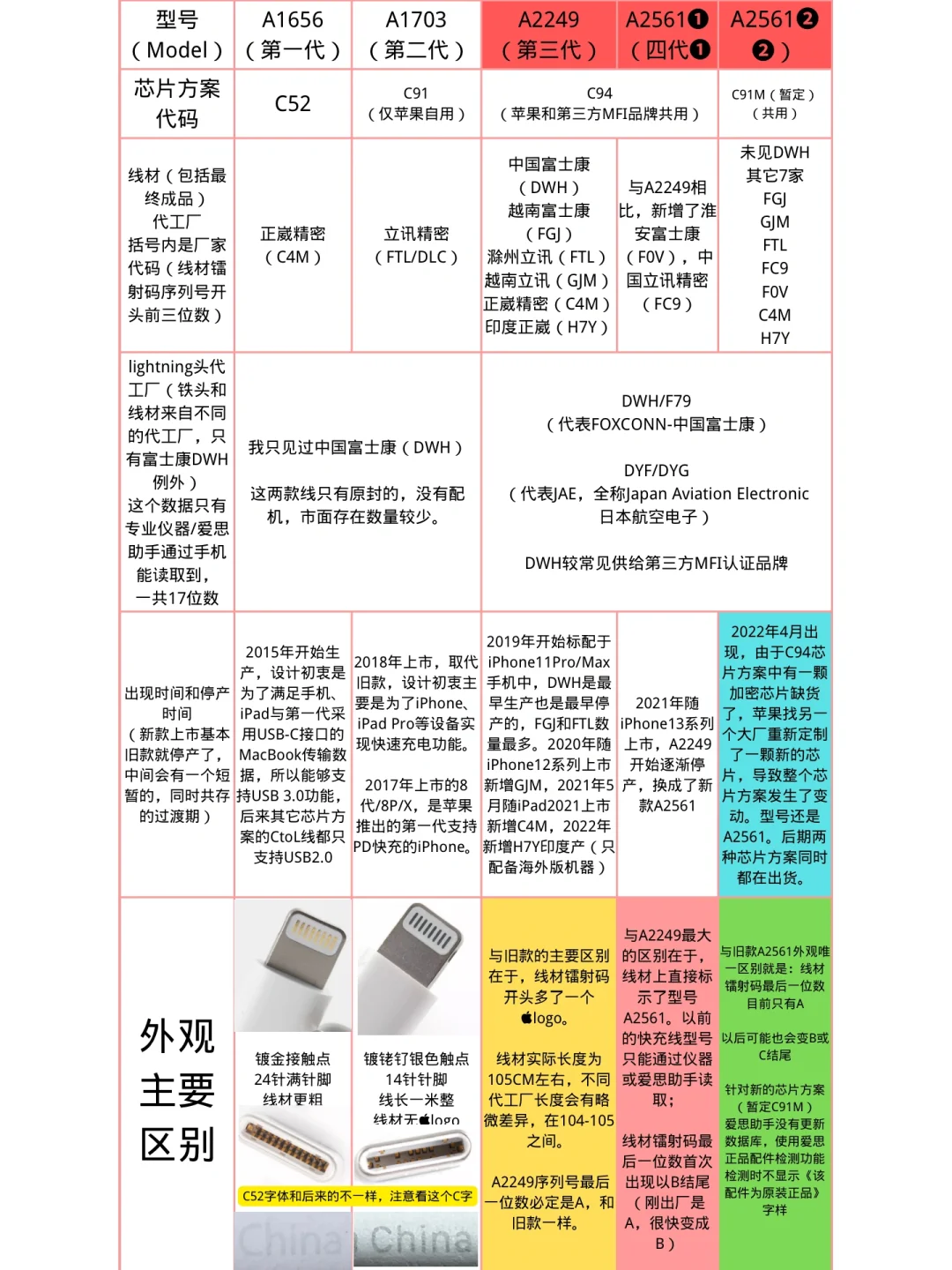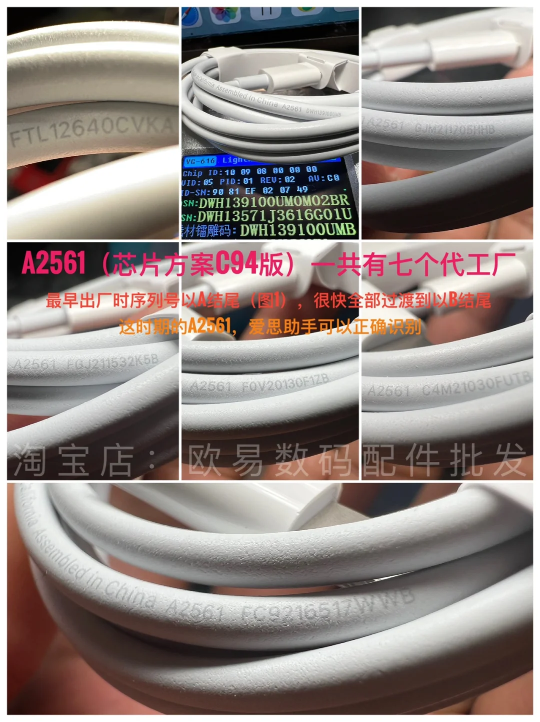 简单介绍一下快充线数量最多的A2249和A2561这两个型号,以及如何通过看是否符合序列号规则来判断真伪。需要特别说一句,符合规则不一定真,但不符合一定假。很多时候即便爱思助手显示为原装,但不符合序列号规则,也是假货