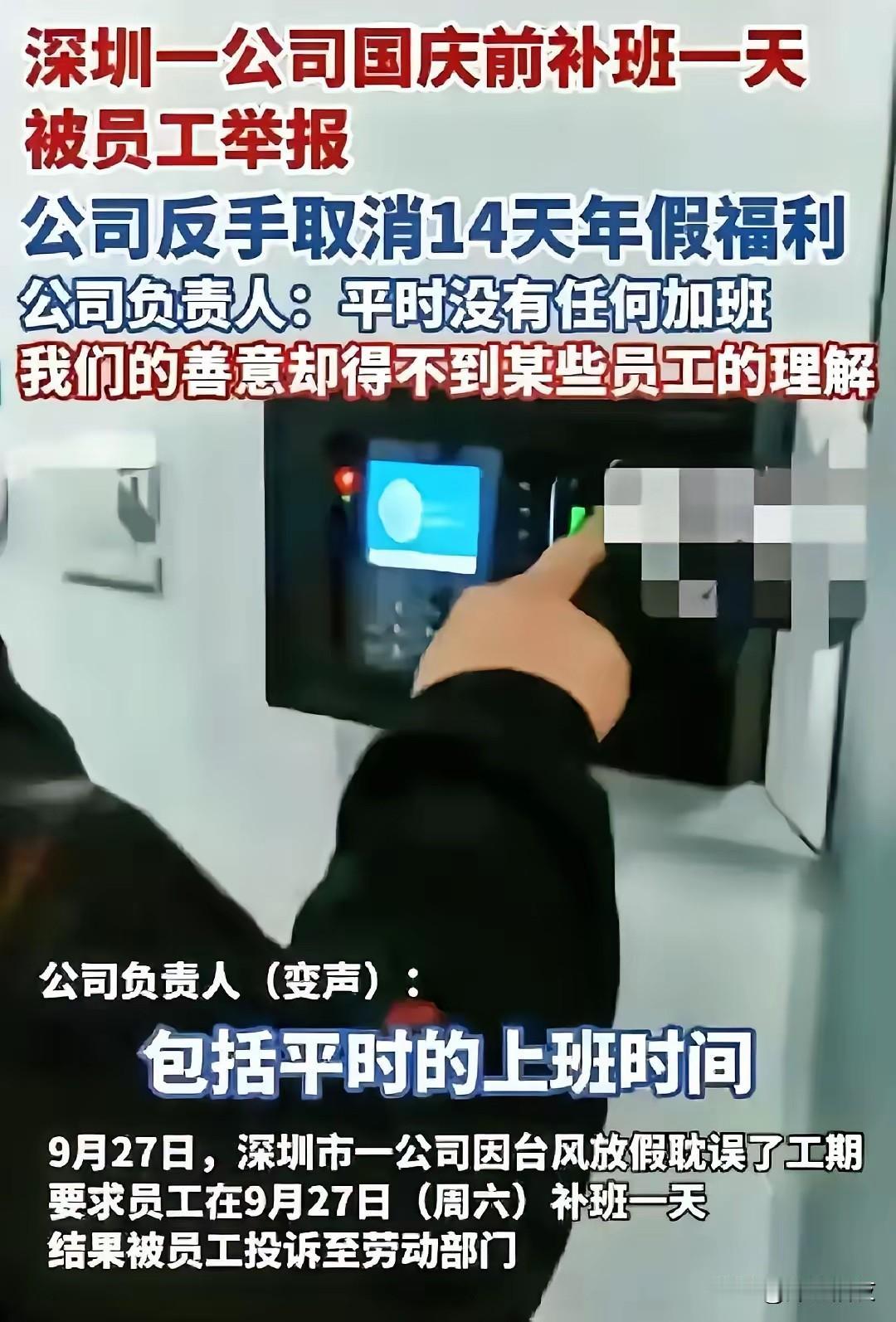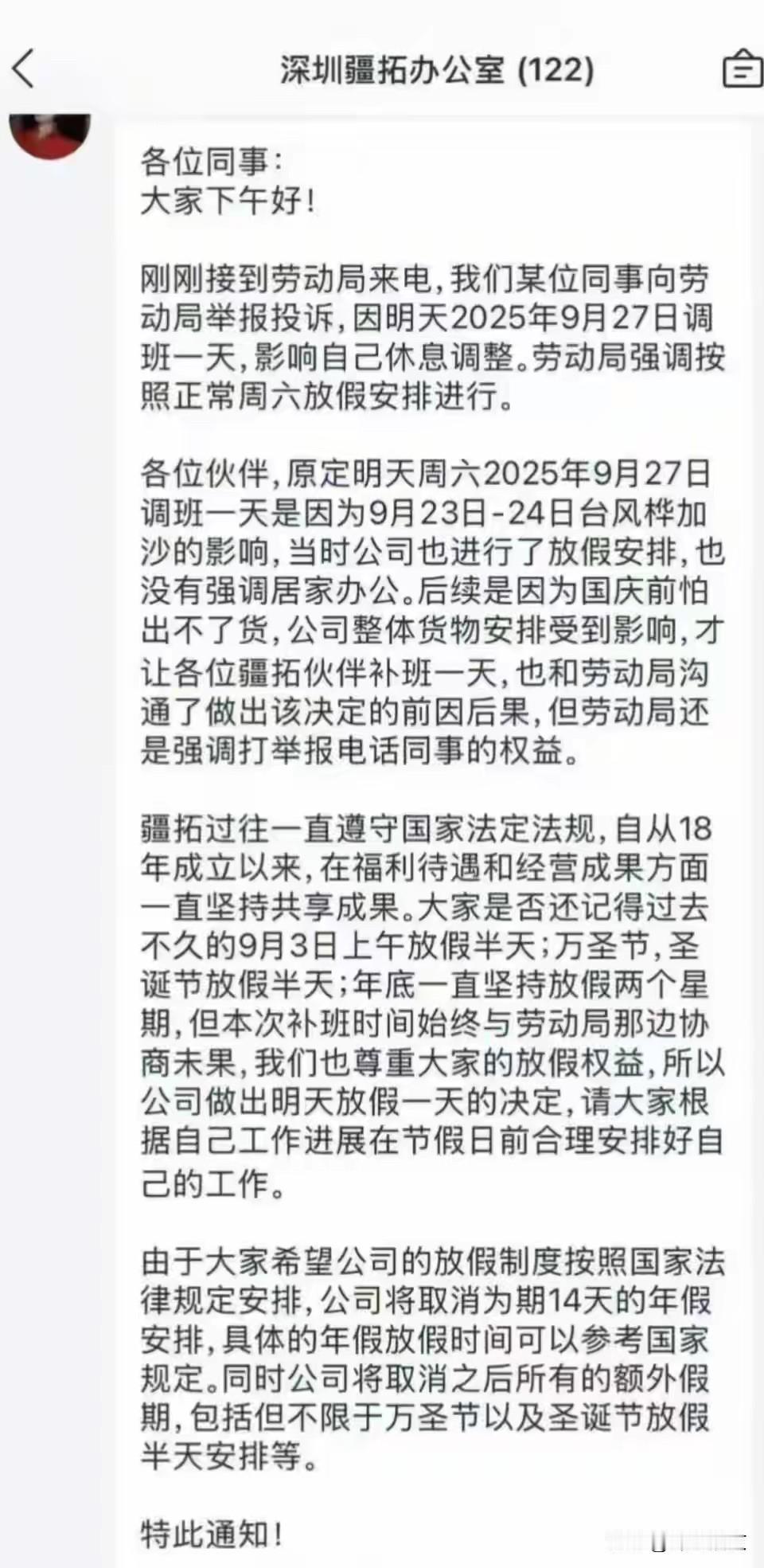 非得把公司逼到丁是丁卯是卯,别忘了,劳动法假期之外,公司还多给了一些假期,这是目前很多单位做不到的。 因为台风放假耽误了工期,要求员工国庆节前补班一天赶工期,结果被投诉至劳动部门,公司彻底调整公司放假制度,严格按照劳动法执行,取消员工所有额外假期。 不说别的,就春节的假期,国家规定只有7天假,公司原来给员工是两周假,不香吗?公司一直为员工考虑,困难情况也替公司考虑,毕竟奔赴是双向的。 真是身在福中不知福! 深圳疆拓公司取消全部14天额外年假 节日调休 法定假调休 企业强制加班 加班劳动法 公司请假 劳动法休假规定 公司不安排工作