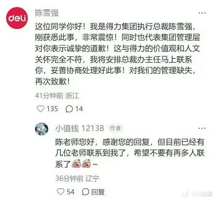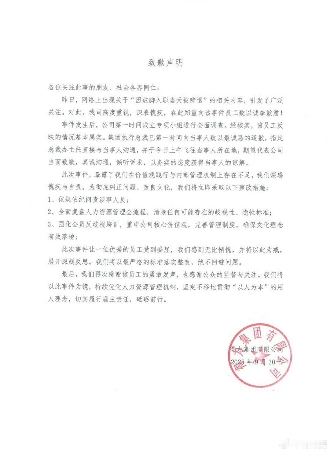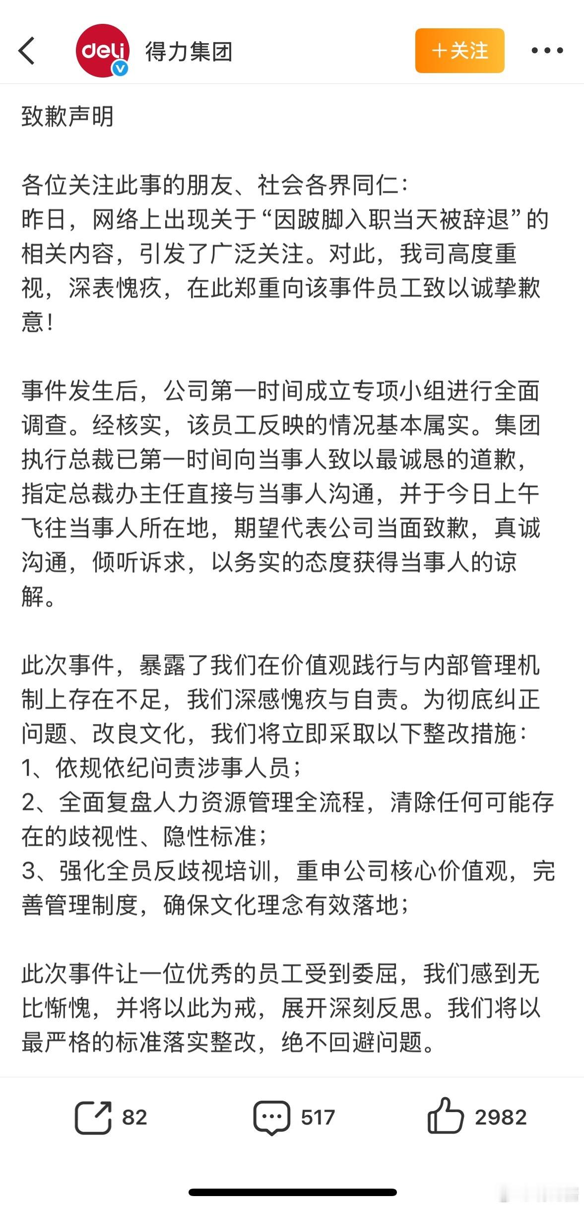 得力集团发致歉声明