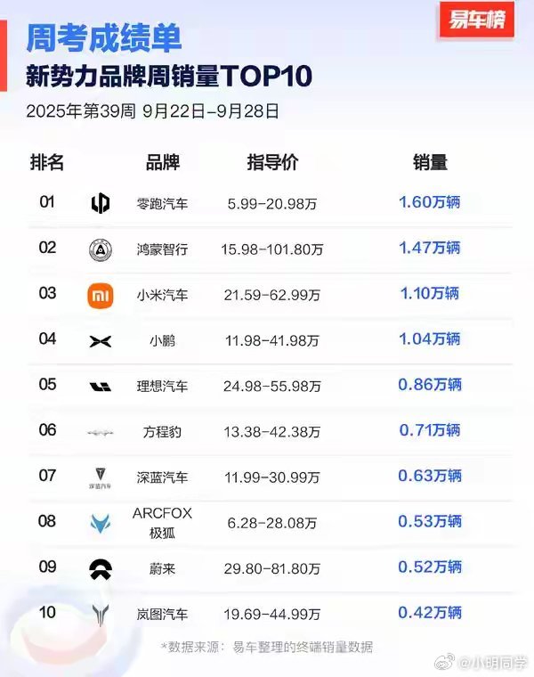 上周造车新势力销量排行榜零跑第一,鸿蒙智行第二,小米第三。