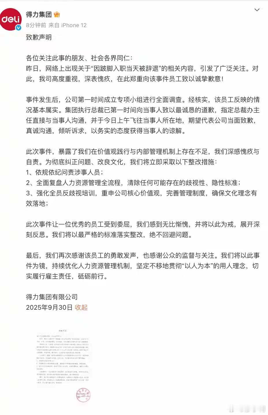 得力集团发致歉声明这一次又让我们看到了舆论监督的力量,让弱势群体得到社会的关注。这不仅是一个人的委屈得以伸张,更是向职场公平迈进的一小步。希望所有企业都能引以为戒,让职场充满阳光。热点观点