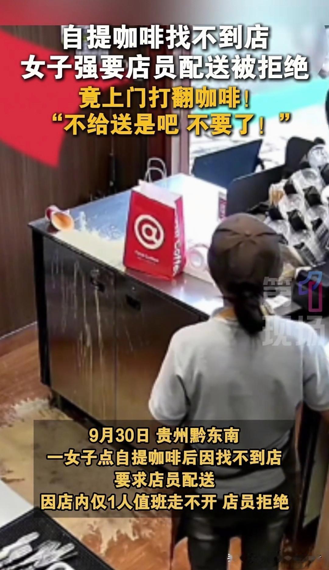 贵州一美女因要求配送自提咖啡被拒,怒将咖啡打翻在地引起网友广泛热议。 9月30日,贵州黔东南一漂亮女子下单自提咖啡后,因找不到店铺要求店员配送。在岗店员因独自值班无法离开,拒绝其要求。女子情绪激动赶到店内,争吵中将咖啡打翻在地后离开,留下店员清理现场。 自提咖啡,可以省点快送费,如果参加某宝的优惠券,这杯咖啡也许就是免费的。找不到店子最终还是找到了,免费的咖啡可以不喝,充当一下发泄武器也是未尝不可。 那句“不给送是吧?不要了!”泼掉的何止是咖啡,更是规则意识与个人修养。 上天给予了这位美女一副好皮囊,应该也给予了她其它方面的不足,不知道是老天爷公平,还是老天爷在捉弄人? 咖啡女孩 咖啡女人 女生咖啡 咖啡姐姐 咖啡少女 网红女咖啡 美女手冲咖啡 咖啡姐 咖啡翻车 咖啡妹 咖啡投诉 红嘴阿姨咖啡 阳泉咖啡姐 无人问津咖啡 咖啡小妹 咖啡妹妹 9点9咖啡 甜朵咖啡 网上咖啡 笨小姐寻咖啡 落单咖啡 贵阳着陆咖啡 咖啡达人秀 雅致手冲咖啡 (相关内容取材于网络)