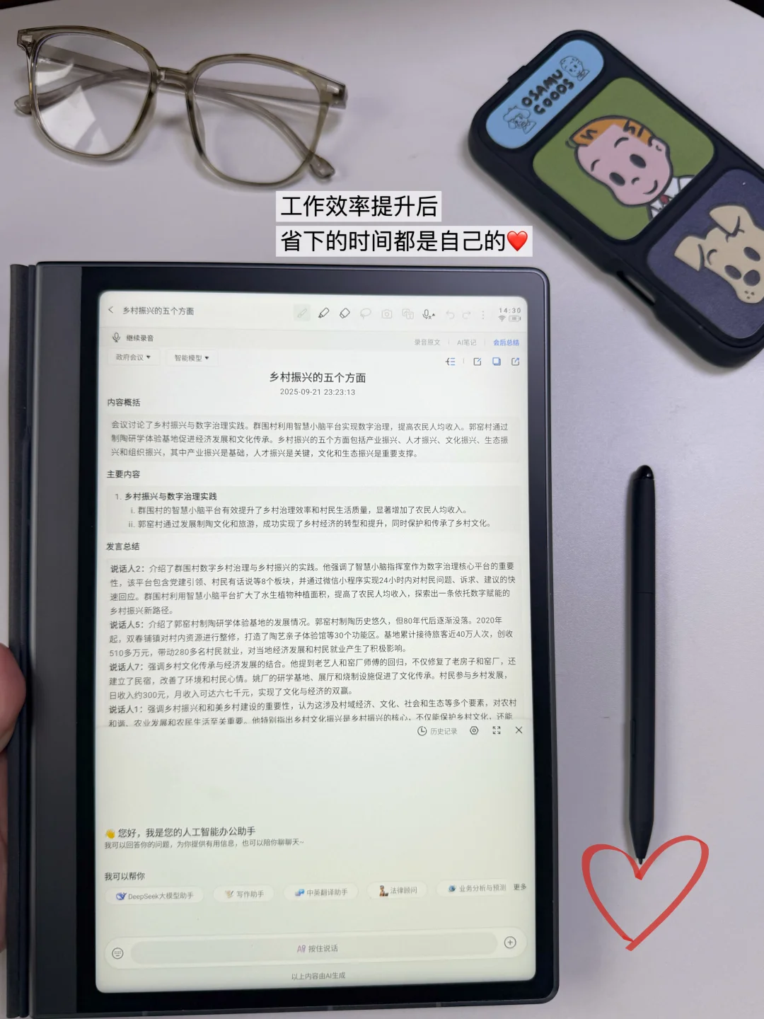 之前提到过,我们单位新人见习期要在各科室轮岗,这简直是大家枯燥工作中的快乐源泉!今年来的几个女生,就让我懂了聪明和灵气的差别。 [彩虹R]“干完活”还是“干成事” 考上编的都是聪明人,但有位女生称她为小A吧,却让大家感受到了什么叫“灵气”。新人入职大都从dirty work做起,她在干完活的基础上,总是再走一步去预判需求、复盘流程[清单R]如汇报工作预判领导需求、整理档案做出时间轴、面对模糊指令复述确认等,很快就独当一面。 [彩虹R]“熬自己”还是“会借力” 新人还在闷头办会、手写记录。她已跟着前辈学借力,用办公费申请了跟我一样的办公利器——思必驰AI办公本X5系列,因为工作性质,不少保密会议都靠手写经常加班但它的Pro版本支持离线语音转写和离线会议纪要生成,数据都在本地智能处理,从此再冗长的会也能“散会即形成纪要” 选它本是因为它的颜值,10.95英寸的柔彩护眼屏,屏幕大且长时间办公眼睛也不会很累;现在却被实力一次次折服。它就像个高颜值又高学历的下属[咖啡R]内置AI助手随时响应,总结重点、分析问题随时在线。 有时会议太长,还能将繁琐冗长内容用AI洞察分析出关键点,把领导着重强调的再提炼出来给我执行建议,功能价值和情绪价值都给够!周总结也都是AI周报根据我的会议记录、待办事项和笔记自动生成[哇R]订阅后直接发我邮箱,有工具就不熬自己,上班状态都更好了。 [彩虹R]“人好用”还是“该提拔” 让领导用着顺手,又很少吭声,会有成为核动力的风险,路就走弯了。但她有主见会及时说不,能干但不瞎干,领导才会给任务也给机会。如接到繁重工作,通过领导要人要材料;棘手工作聪明催活。别人夸她从不说“很能干”,而是“该提拔”“有前途”。 [彩虹R]“谈公事”还是“聊私事” 出差培训中的闲聊,新人大部分会谈工作、单位话题。但她总是趁机把话题拉到生活区,她很懂“交集蔓延到生活区是关系的质变”,话题又都在“孩子、单位旁新餐厅、对方穿搭、年假旅行、薅羊毛、养生”等话题安全区,所以和领导同事关系总是更近[偷笑R] 睿智、饱满、鲜活的灵气不是人人都有。灵气往往是一种悟性、主动创造性和内在驱动力,聪明是能干,灵气是会干。有灵气的女生才是将来会有大出息的女性! 体制内打工人 初入职场的菜鸟 职场干货 职场