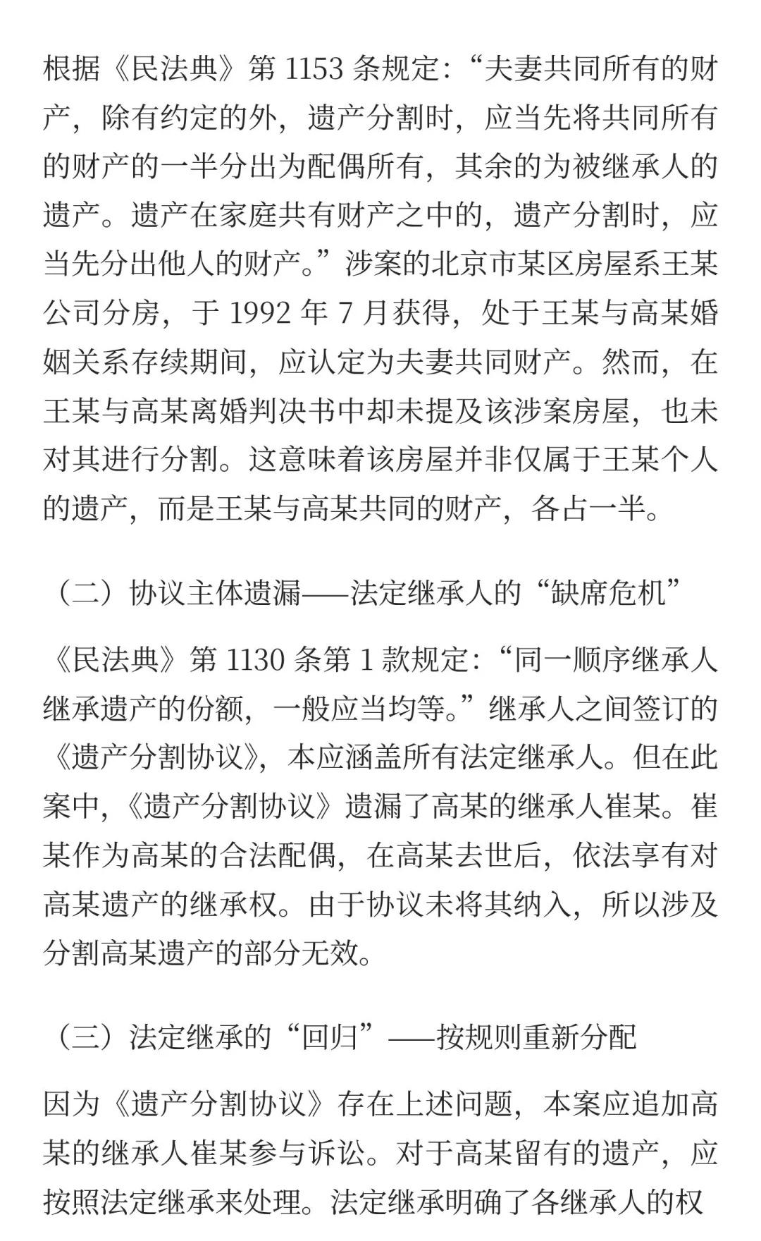 遗产分割“迷局”:一份协议为何被法院“戳破”? 高某五去世后,其子高子继承北京市某区房产42/72份额,高女7/72份额,高某四、高某五各1/12份额,崔某1/12份额。法院认定《遗产分割协议》因遗漏法定继承人崔某无效,房产按法定继承重新分配。 法律服务 律师咨询 律师 北京律师 法律咨询 遗产继承 继承纠纷 遗嘱继承 遗产分割