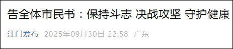 昨日(9月30日)22时许,据“江门发布”消息,广东省江门市发布告全体市民书。号召全市上下要继续绷紧防控之弦,做到假期防控不放松、灭蚊行动不停歇。