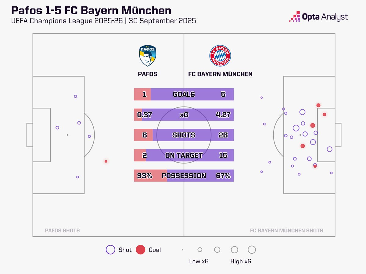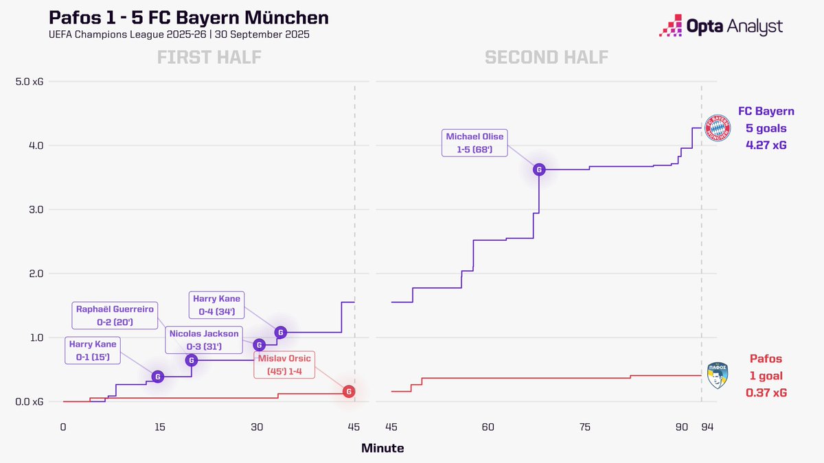 据Opta统计,这是拜仁慕尼黑自从2019-20赛季客场7-2击败热刺以来(当时凯恩还在热刺效力,并在那场比赛中打入一球),所取得的最大比分的欧冠开局客场胜利。