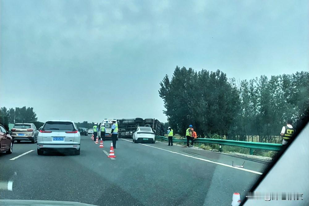 800米走了20分钟, 前面大货车翻车,希望人员安全。 警察来了,120来两辆,拖车来了, 大货车直接侧翻在了右车道, 后面停了一辆私家车。 这一路堵的,前后左右全是车,可不就是网友说的“鸳鸯锅”了!看这个节奏,等清理完路段,还得一段时间,后面车辆慢慢等吧,着急也没用,天黑了,注意安全!