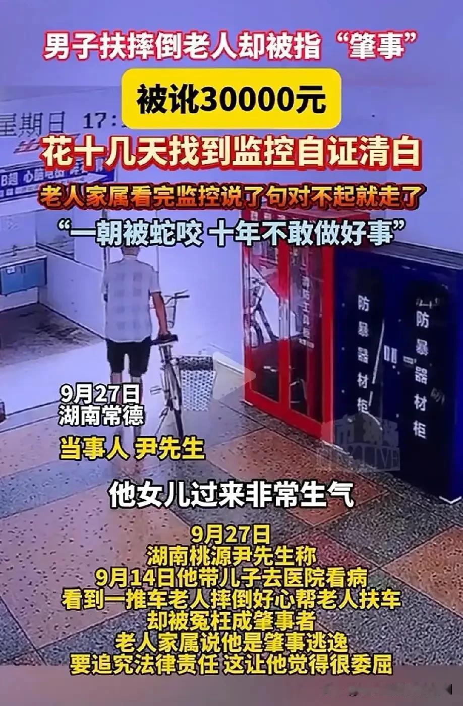 湖南常德,男子见一老人摔倒,出于好心把老人扶起来。结果一句感谢的话没有,却被老人的家属认为是肇事者,不仅要求男子赔偿3万元,还要追究男子的责任。为了证明清白,男子花了十几天找到监控。交警大队也回应,男子与老人并没有接触。可面对铁线的证据,老人家属只说了一句“对不起”就走了。(来源:观威海) 如果在路上遇到有老人摔倒,那么你敢不敢把老人扶起来呢?最近,尹某的经历,给所有人上了一道生动的社会实践课。 事情的大致是这样的。 9月14日的那天,尹某带着自己的儿子去医院做检查。在路上见一老人推着车,不小心摔倒了。 尹某见状,几乎没有任何的犹豫,就停好车,帮助老人把车给扶起来,还细心的询问老人的身体有没有大碍。 做这件事情,尹某并没有打算能够得到对方的感谢,可没想到,等老人的家属来到现场之后,画风突变。 老人的家属坚持认为老人之所以摔倒,以某就是肇事者,要求尹某赔偿3万元,并要追究尹某的责任。 虽然尹某一再解释,自己仅仅是路过,好心帮老人扶起来,并不是肇事者。可老人的家属不信,天底下哪有那么多的好心人? 为了自证清白,尹某对事发现场周边的设施进行盘查,经过十几天的折腾,尹某终于找到了事发时的监控录像。 可面对铁一般的证据,面对尹某十几天的心血,换来的就是老人家属一句轻飘飘的“对不起”。 内心无法释怀的尹某,将自己的亲身经历向媒体进行了曝光。 那么从法律的角度,该如何看待这件事呢? 首先来说,尹某为了能证明清白,自己花费十几天的时间去寻找证据。其实,当自己被冤枉时,尹某最好的选择是报警。 《人民警察法》第二十一条规定,人民警察遇到公民人身、财产安全受到侵犯或者处于其他危难情形,应当立即救助;对公民提出解决纠纷的要求,应当给予帮助;对公民的报警案件,应当及时查处。 当面对他人的误解甚至是冤枉的时候,尹某完全有权力报警寻求帮助。而一旦民警介入之后,肯定会对事情的来龙去脉进行调查。 其次,老人家属在没有任何依据的情况下,仅凭个人主观猜测,就要求尹某赔偿3万,可能构成敲诈勒索。 敲诈勒索是指以非法占有为目的,对公私财物的所有人、保管人使用威胁或者要挟的方法,勒索公私财物的行为 。 需要注意的是,敲诈勒索不要求实际取得财物,只要实施了该行为,就可能受到处罚 。 而根据《治安管理处罚法》第四十九条规定,敲诈勒索公私财物的,处5日以上10日以下拘留,可以并处500元以下罚款;情节较重的,处10日以上15日以下拘留,可以并处1000元以下罚款 。 如果尹某感到意难平的话,完全可以报警处理。 另外,老人的家属给尹某造成如此严重的困扰,绝对不是一句轻飘飘的“对不起”,就能解决问题的。 老人家属的行为,不仅伤害了尹某,同时也伤害了广大热心网友的心。如果所有的老人都这样,又有谁敢伸出援手呢? 对此你怎么认为呢?关注@胡究法的如法炮制 多学法律少吃亏。