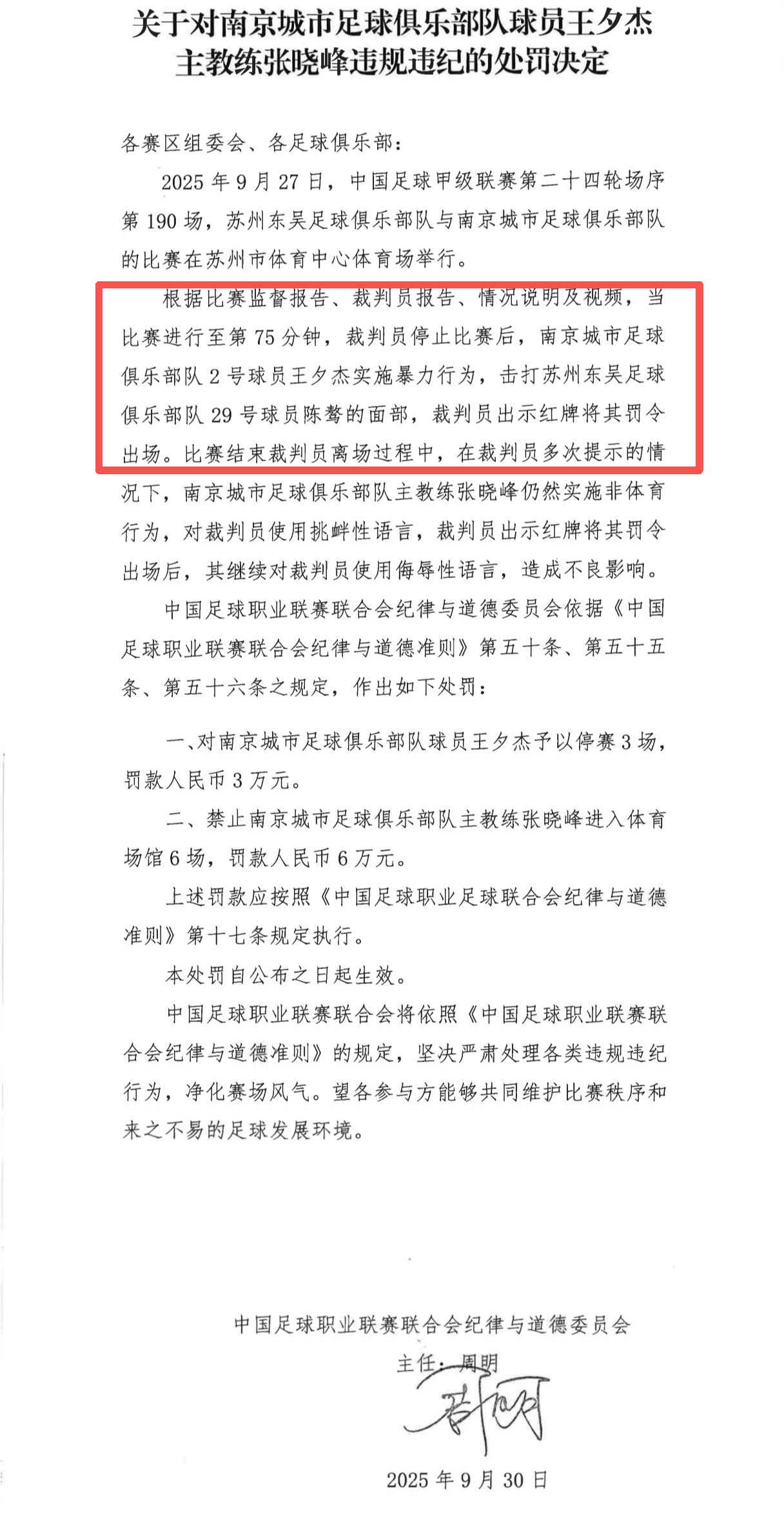 但就在昨天晚间,中足联刚以暴力行为为由对王夕杰禁赛3场。