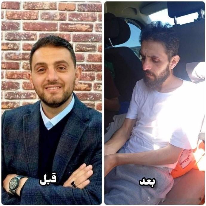 以色列说哈马斯故意不给人质饭吃,导致人质因饥饿瘦成皮包骨。但以色列似乎也做了同样的事。 当地时间10月1日,以色列当局释放了一名被其非法关押长达两年的巴勒斯坦记者Mohammed Nimer Oseida。 其被释放后的体态(图右)与刚被以军抓进监狱前(图左)简直判若两人,整个人消瘦了不止一圈,面容几乎脱相。