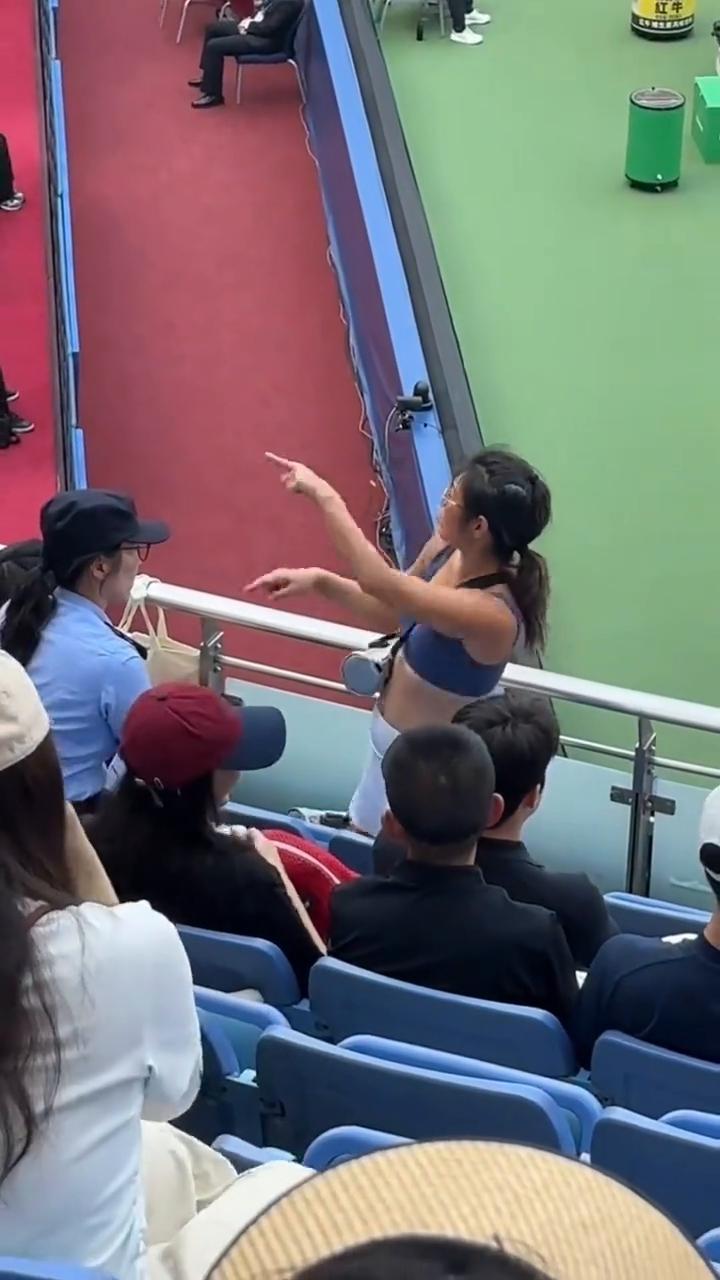 劝阻无效,手舞足蹈,大声喧哗,比赛正在进行中,继续不听劝阻,亮出外籍身份,主裁暂停比赛,请她离开。赖着不走,情绪失控咆哮,吓坏孩子。上海大师赛的疯狂粉丝。
