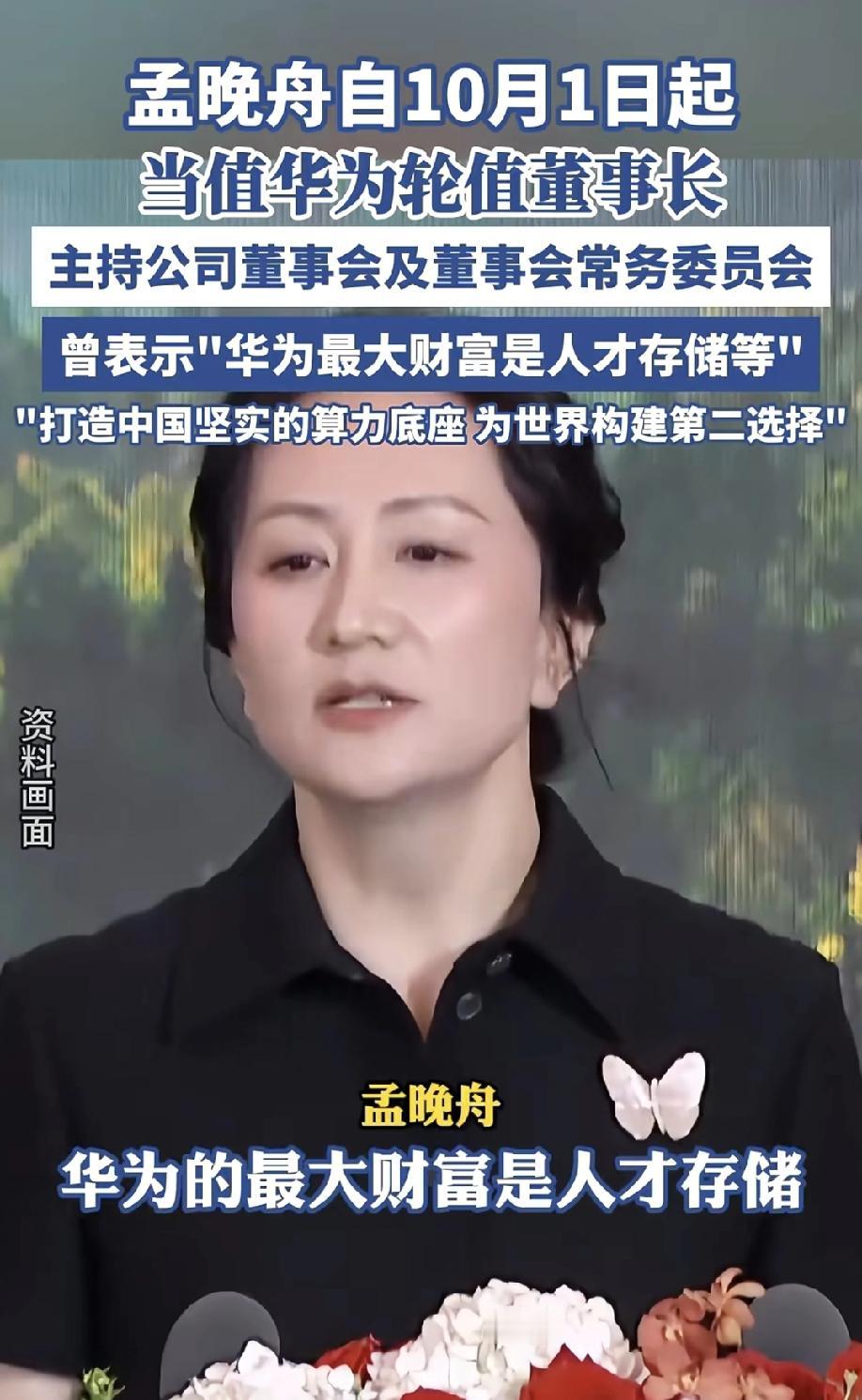快讯!快讯!华为突发官宣!孟晚舟10月1日起第三次当值轮值董事长,掌舵到明年3月底,这哪是简单的职位轮换? 别再拿“任正非女儿”贴标签了,华为选她,根本是选了个能扛事的“数字化掌舵人”。从1993年进华为打杂,到现在站在决策核心,她32年只干了一件事:把财务变成华为的战略武器。 2003年搭全球财经架构,2007年推IFS变革磨了八年,2014年搞数据变革实现“数出一孔”,现在华为130多个代表处能全天循环结账,全是她的功劳。她早把财务做成了“作战指挥平台”,用数据帮华为踩准每步战略。 这次接手正是关键期,鸿蒙要冲关,AI算力要破局。她的财经背景就是底气,能精准把钱砸向技术刀刃上,这比单纯懂技术的领导更懂“怎么赢”。 华为的轮值制度从不是形式,要的就是这种懂业务、通数据的复合型领袖。她用实力证明,职场逆袭从不靠身份,靠的是把专业熬成核心竞争力。