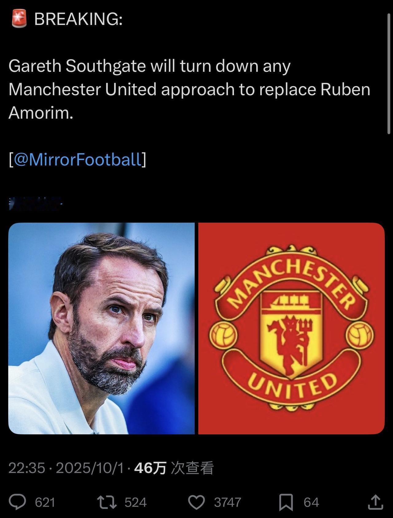 拉爵亲自邀请无果。 加雷斯·索斯盖特拒绝曼联,他不会接受鲁本·阿莫林离开后曼联主教练的位置。 🔵南门一定读过三国[吃瓜群众] 🔵拉爵不来个3请,看来他是不会出山的 🔵他的隆中对:和好烂稀泥,保证能保级