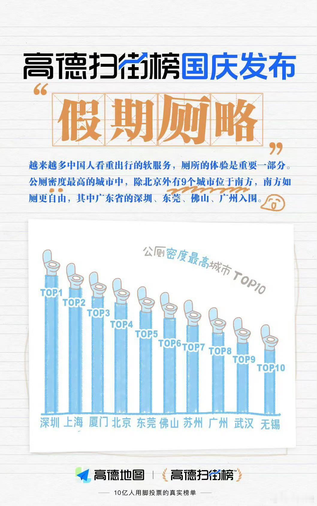 高德扫街榜越来越全能了[允悲]连城市的厕所数量/密度/人流量高峰期都能显示出来。