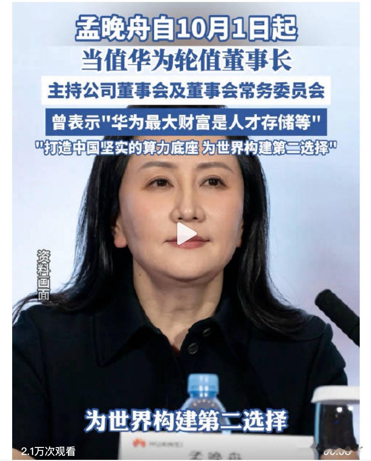 孟晚舟估计现在要吐血了, 不是因为自己第三次当值轮值董事长, 而是她这次当值居然还上了热搜… 孟晚舟将在2025年10月1至2026年3月31日期间当值华为的轮值董事长, 这个轮值有三个人,1972年出生的她是最年轻的, 她就职时候就直接说,不要把命运系于一个人。 表明了她对华为的经营态度, 华为不是他们家的。 果然年轻思想就更开放一些,不执着。 而她自己已经经历了非常多, 风雨中开出的玫瑰更加有韧劲。