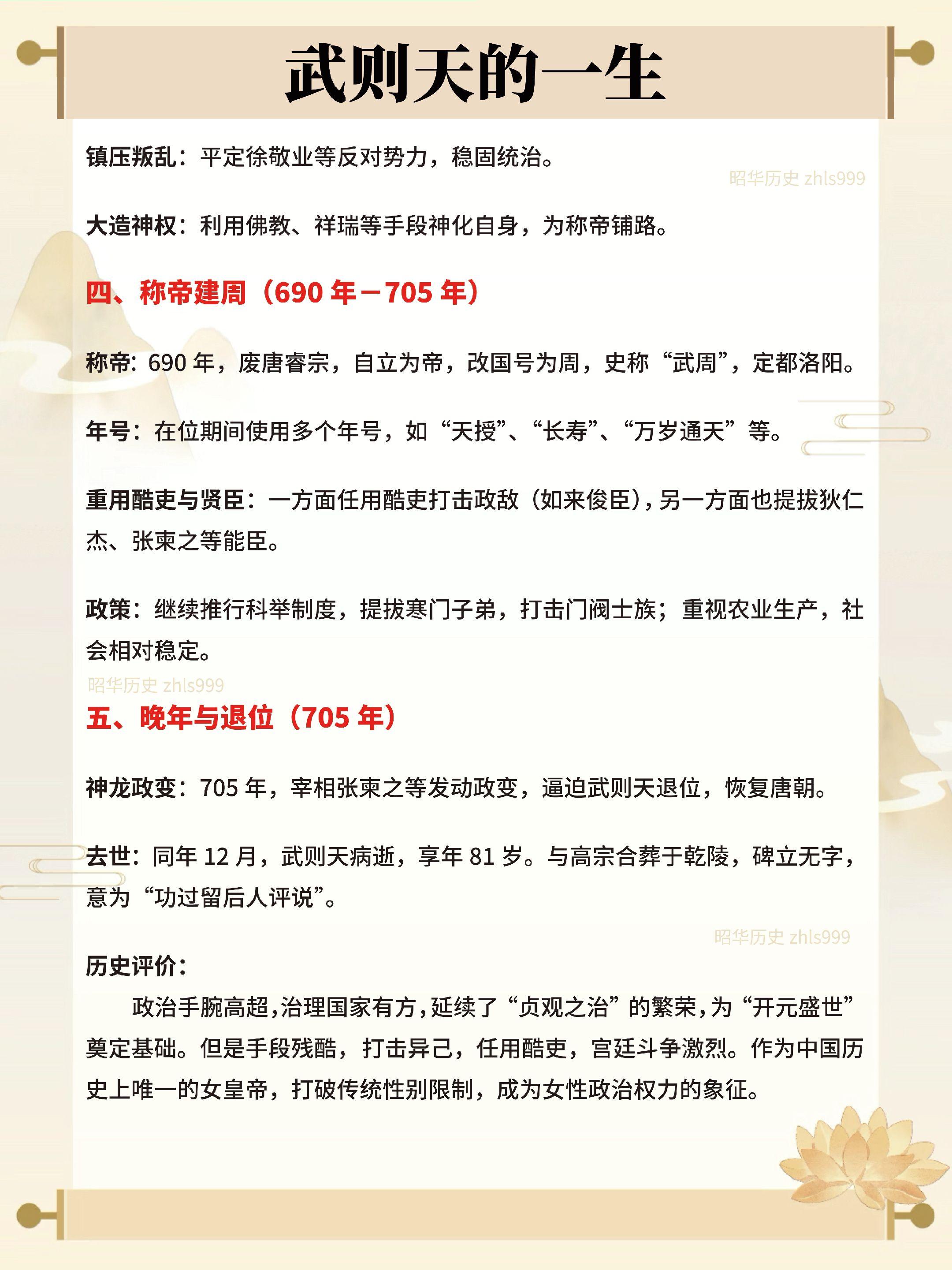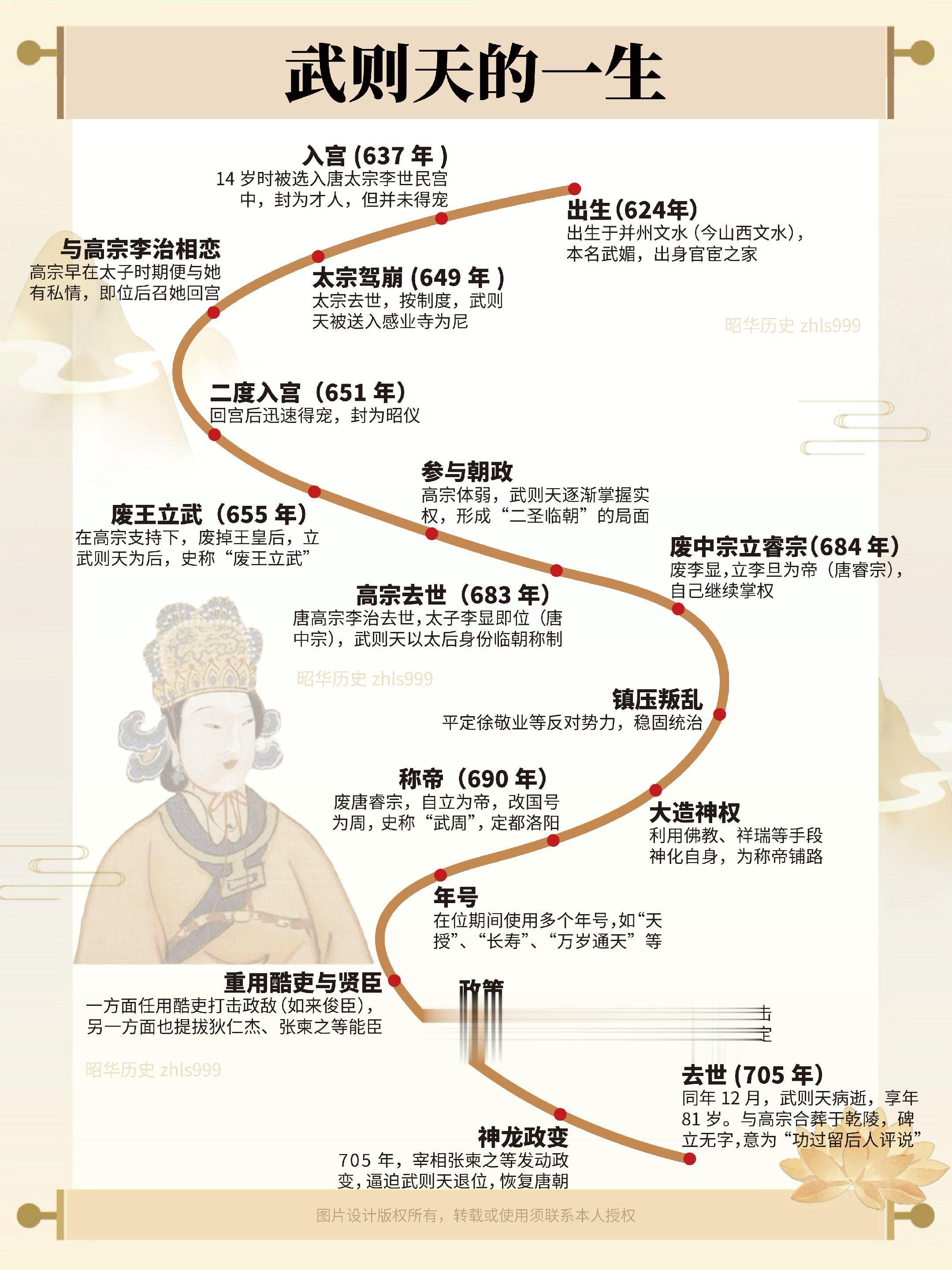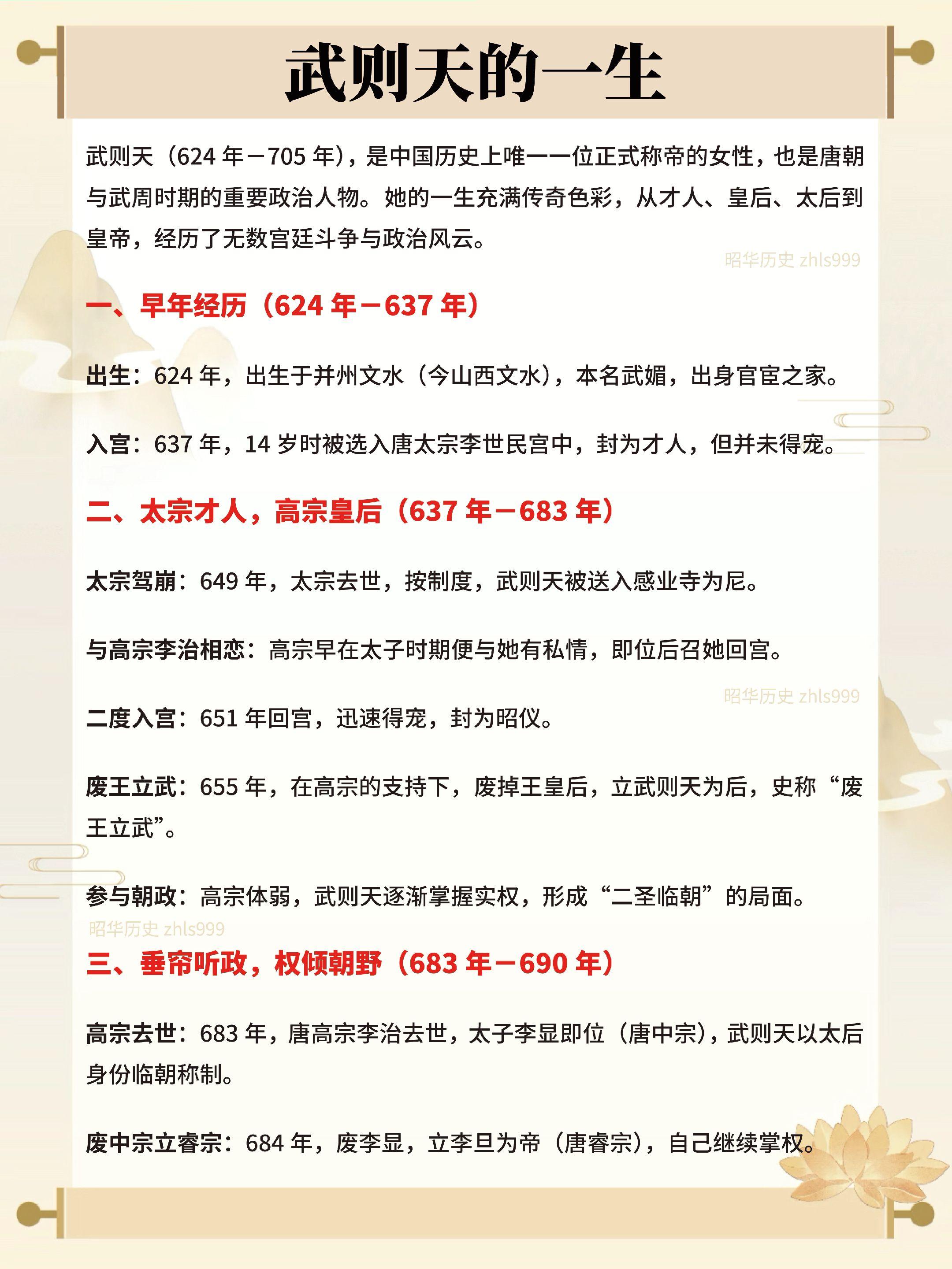 武则天的一生。武则天(624年-705年),是中国历史上唯一一位正式称帝的女性,也是唐朝与武周时期的重要政治人物。她的一生充满传奇色彩,从才人、皇后、太后到皇帝,经历了无数宫廷斗争与政治风云。