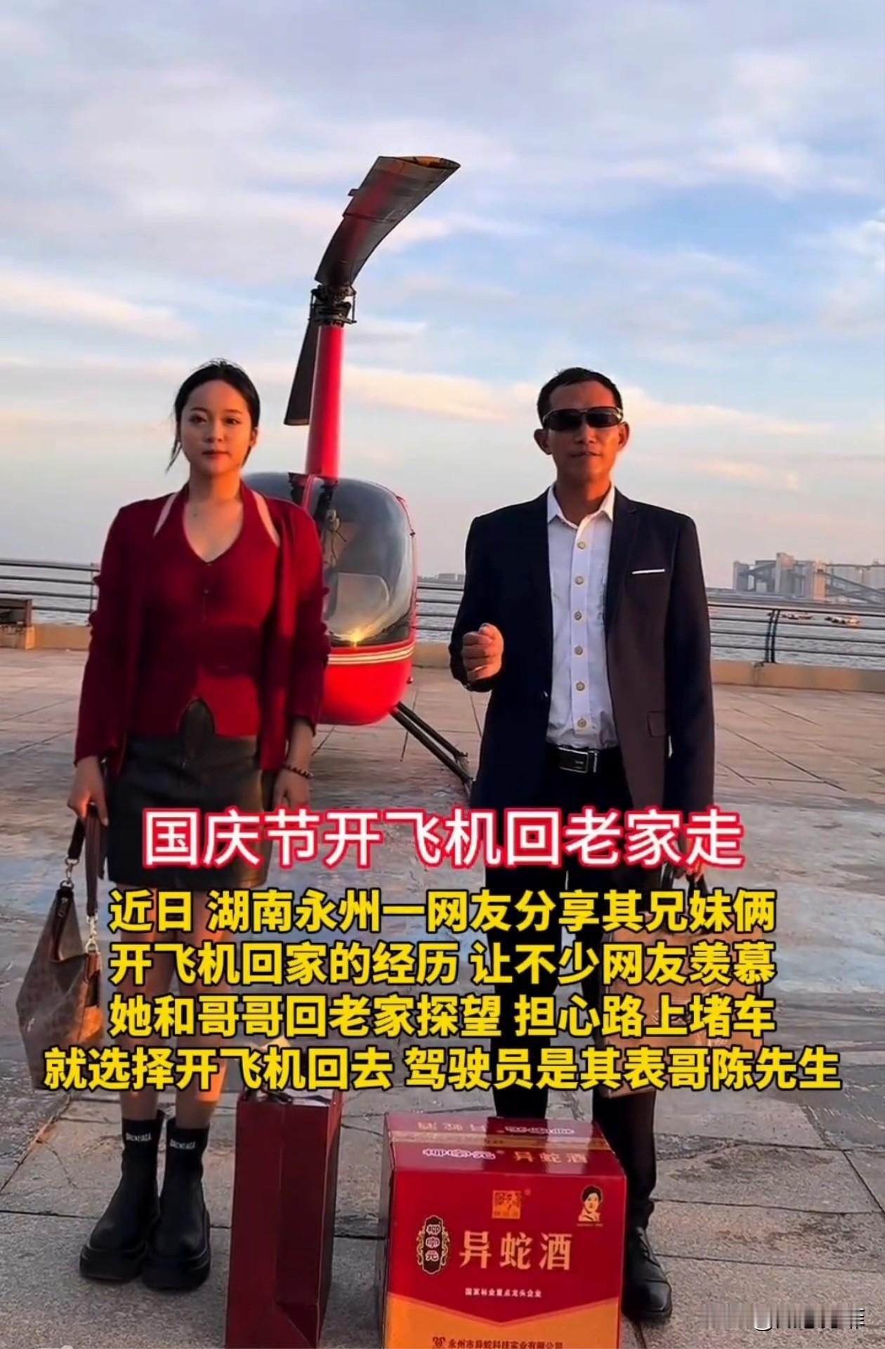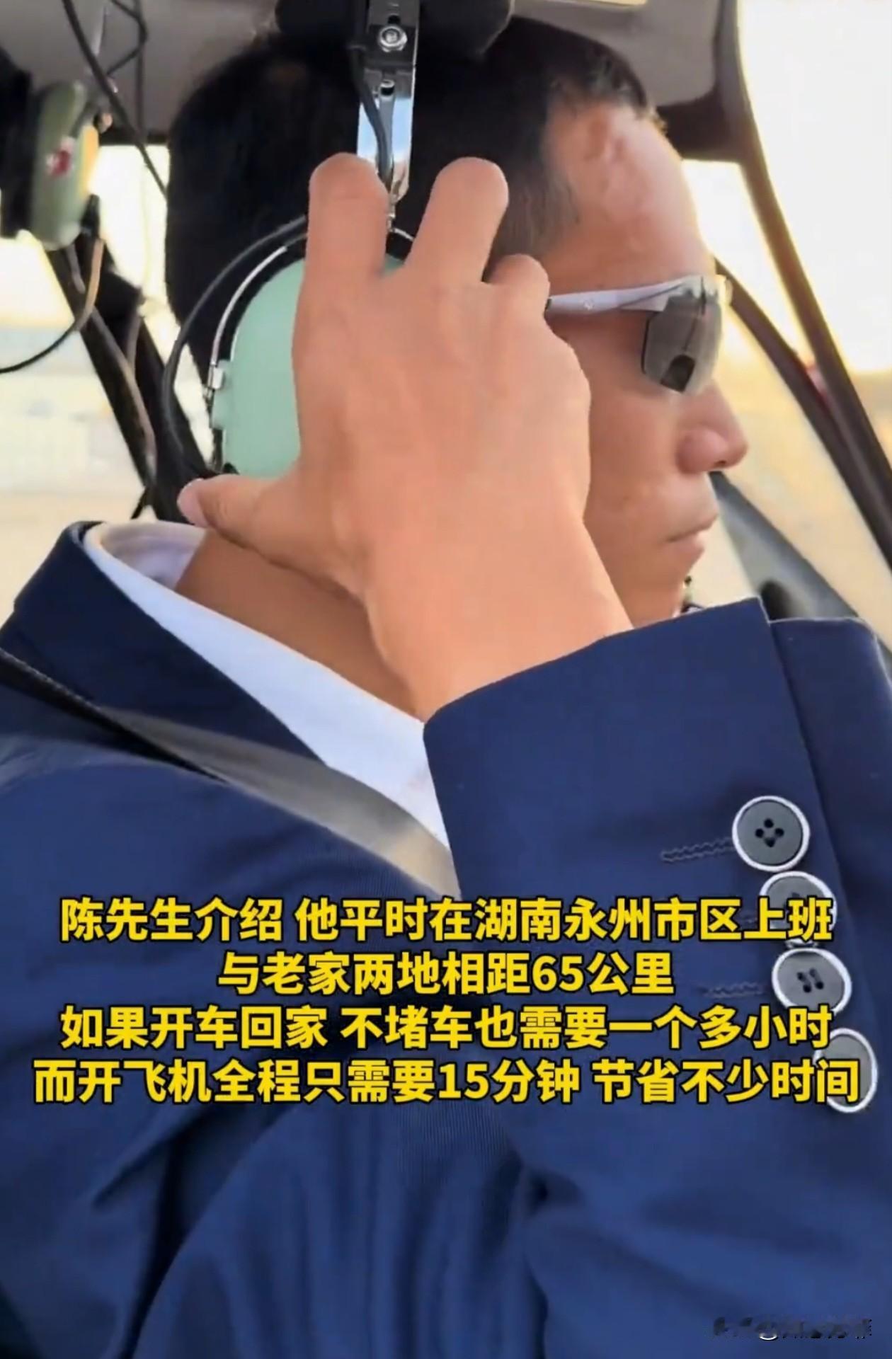 一男子开飞机带着妹妹回老家过国庆,65公里路程开车要一个多小时,开飞机只要15分钟。当事人:经常开飞机回家,村里人都见怪不怪。 湖南,男子平时在永州市区上班,老家在65公里外的东安县,国庆放假想回去看亲人,但怕地面道路堵车,所以决定开飞机。 男子有正规的私人飞行执照,自己公司就有十余架飞机,开飞机对他来说和普通人开车一样熟练。 最后他带着自己的妹妹,只飞了15分钟就到了老家,比开车省了一大半时间,也完美避开了地面的拥堵。 不少网友觉得开飞机回老家很稀奇,但男子说,他经常这么干,村里人都见怪不怪了,不少乡亲还坐过他的飞机,早就不是什么新鲜事了。 还有人表示非常羡慕男子能开飞机回老家,节假日堵车很常见,开飞机能节省不少时间。 不过开飞机也不是完全没烦恼。男子说,他们公司基地训练的时候,十几架飞机同时上天,偶尔也会出现排队“堵机”的情况。 羡慕归羡慕,但也得保持清醒,开飞机回老家是行业从业者的专属福利,普通人难以复制,期待未来能有更普及的低空出行方式。