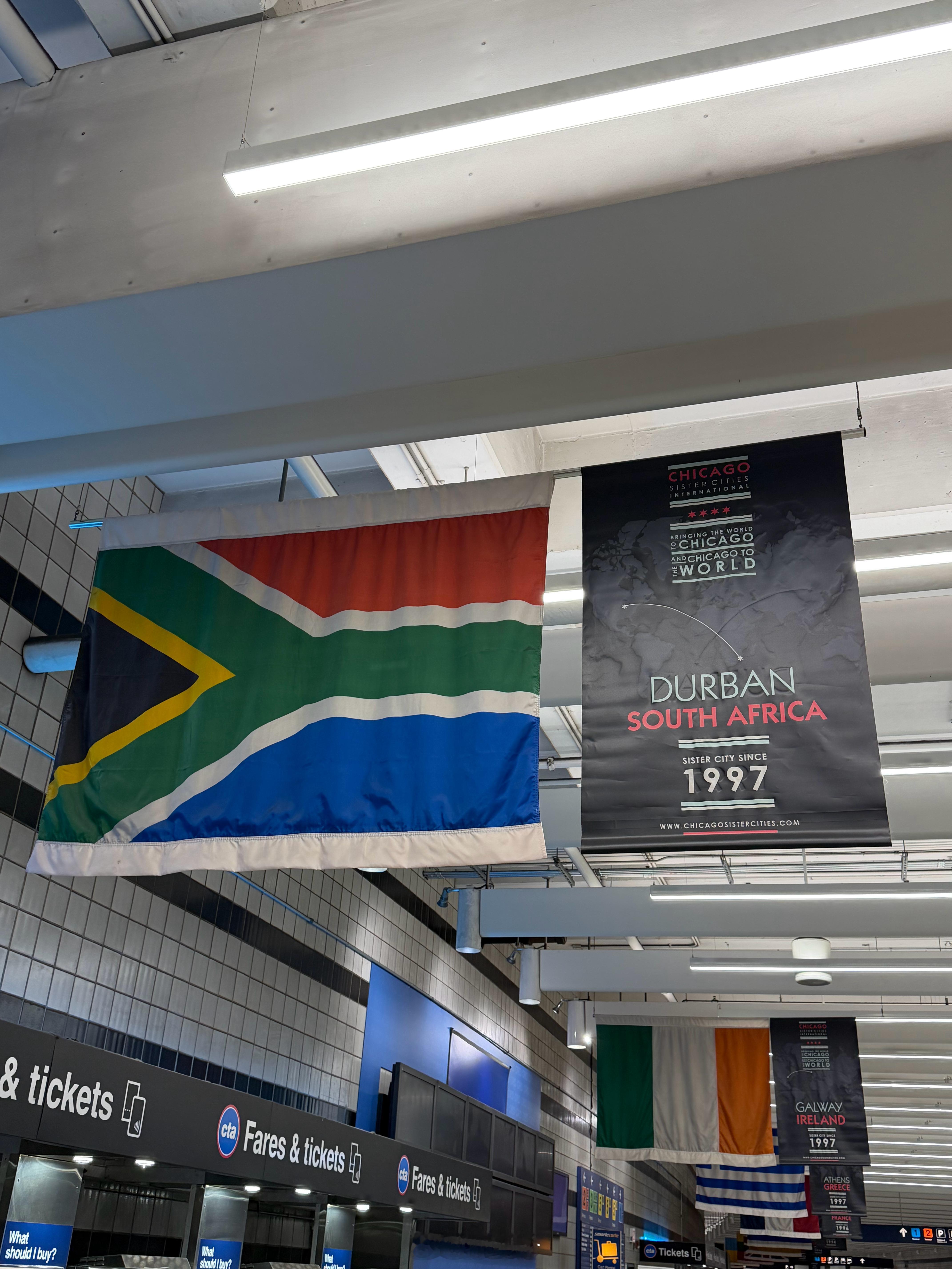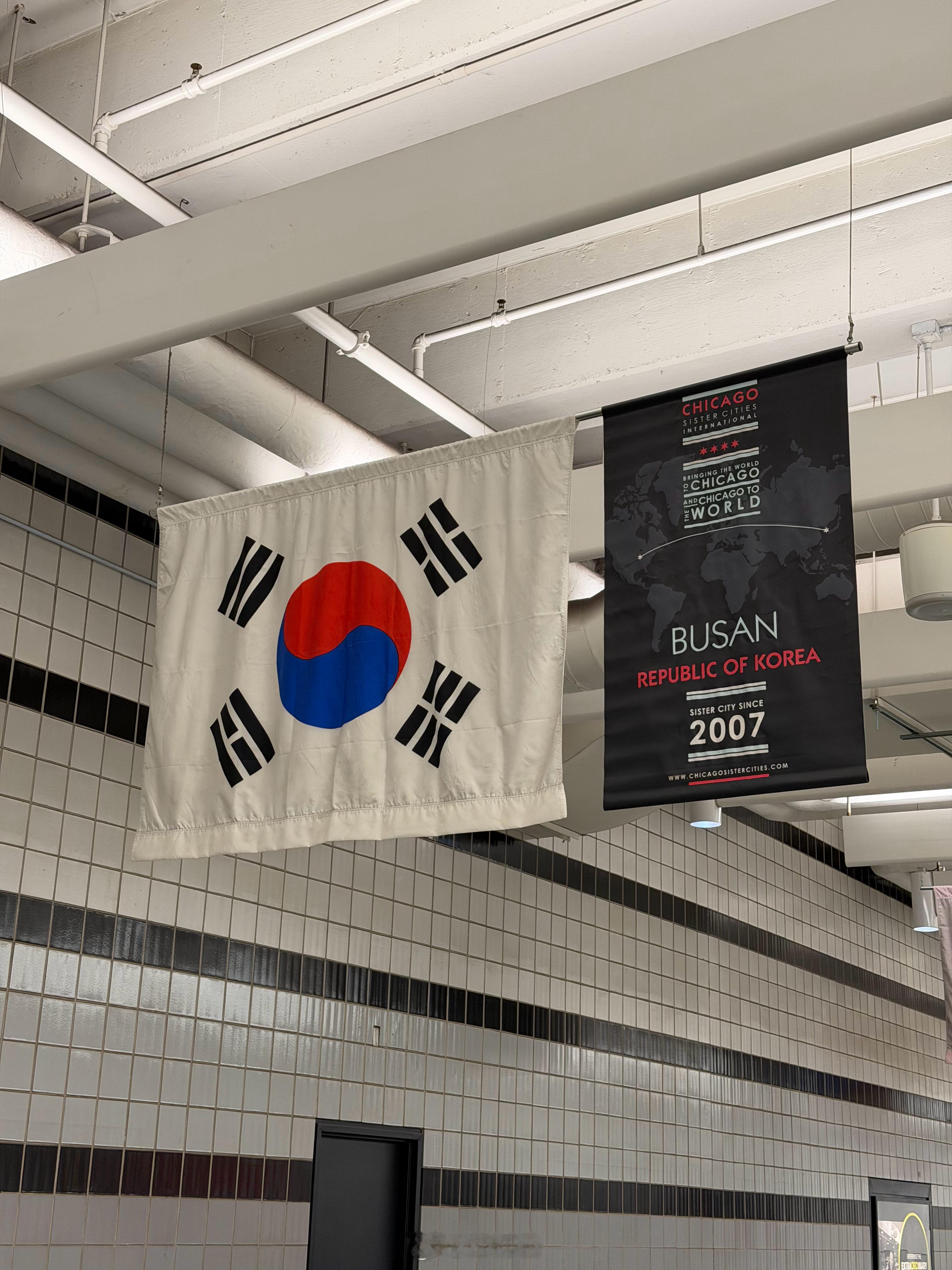 落地芝加哥机场,坐地铁的时候发现走道里铺满了国旗,一开始还以为是机场与各个国家通航的排名,查了一下是成为姐妹城市的时间,中国是1985年和上海,在芝加哥的城市排名中是前五。这还挺有意思的。