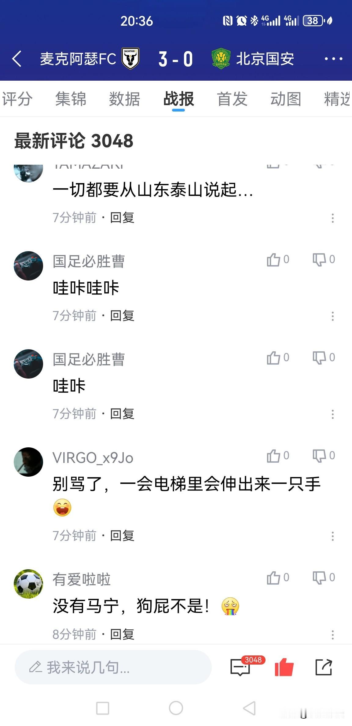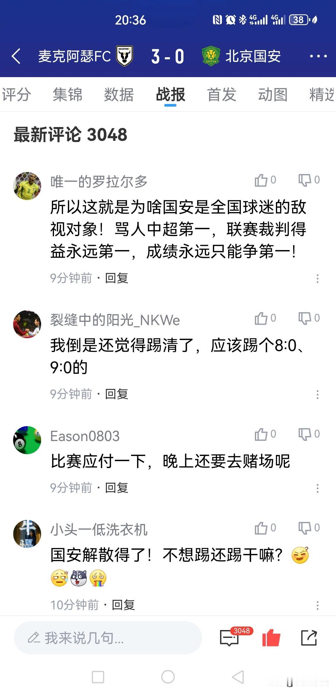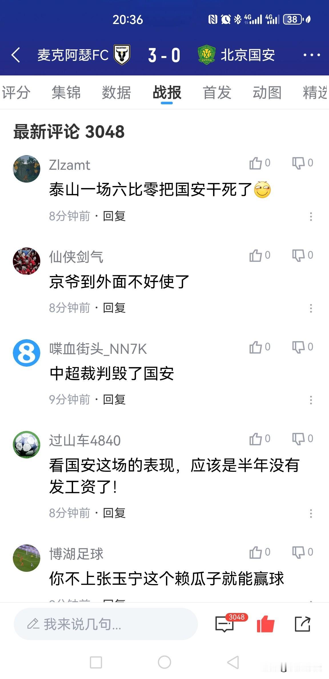 丢人丢分!北京国安亚冠赛场0:3不敌麦克阿瑟FC!亚冠赛场已经是六场不胜!小组仅积1分,排名垫底! 小组赛中可以说是这对手实力并不是很强,还有越南公安,可以说是北京国安在这小组中应该是非常有实力晋级的球队,没想到北京国安在这场小组赛中排名垫底了! 本场比赛可以说是败局早定,球队从主教练和队员上根本就没有必赢的信心,想赢的决心!更丢人的是,比这种发生了冲突,池忠国故意铲人,造成了两队之间大规模的推搡!真是丢人丢大了! 本场比赛过后,评论区得球迷,可以说是炸了锅!对北京国安这样的表现非常不敢苟同!作为中超劲旅、豪门、年年争第一的球队,竟然到了国际赛场给中超丢脸了!