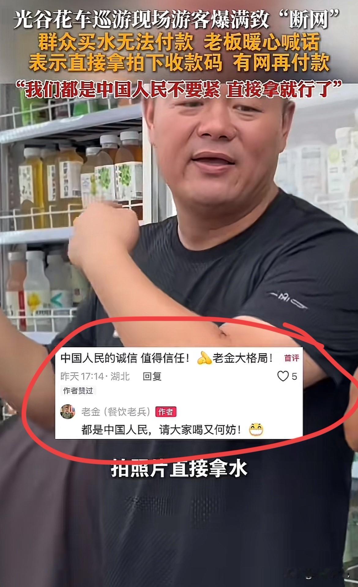 10月1日武汉光谷花车巡游现场,游客爆满直接干到“断网”,买水的群众付款码根本扫不出。结果老板大手一挥:“直接拿!拍个收款码照片,有网了再付!我们都是中国人民,不要紧!” 你敢信?在这个处处讲利益的时代,还有人敢玩“信任游戏”。老板这波操作,不是傻,是他看准了咱中国人的诚信底色。后续也真没让人失望,网友晒出的付款记录里,那一个个到账提示,就是最好的回应。 老板“凭良心付款”式卖水,这波信任牌打得太暖了[赞][赞]