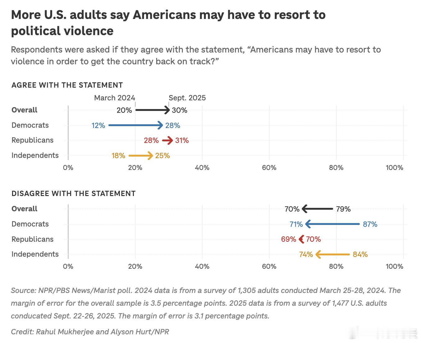 NPR/PBS News/Marist本周发布的民意调查显示,30%的受访者“强烈同意”或“同意”认为“美国人可能不得不诉诸暴力”才能引导国家走向正确的方向。相比之下,3月份的一项调查中,持相同观点的比例仅为19% 。