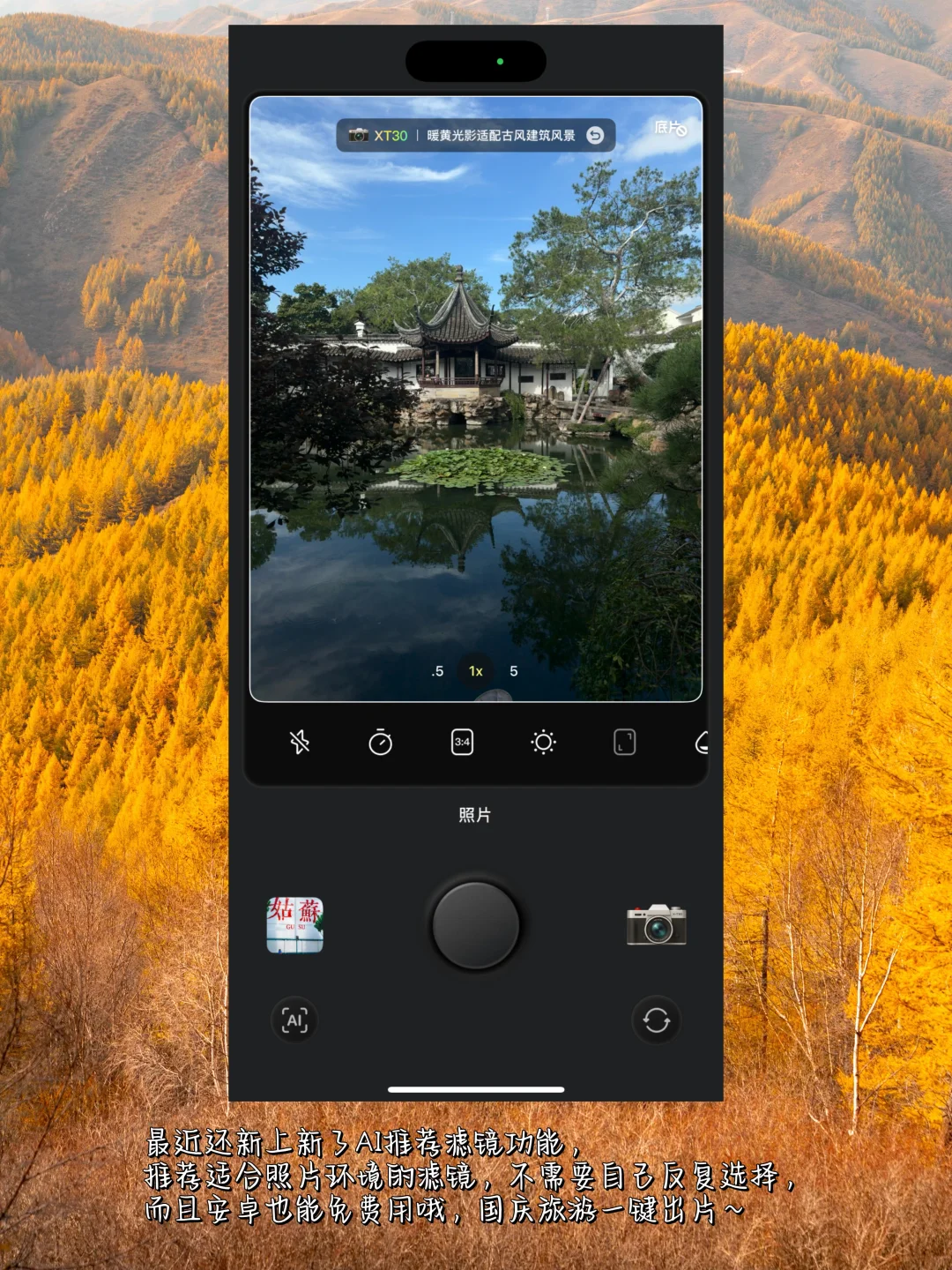 最近还新上新了AI推荐滤镜功能,前两天去苏州逛园林发现很好用,它可以推荐适合照片的滤镜,不需要自己反复选择,而且安卓也能免费用哦,这个国庆旅游我决定继续带着Kapi相机出发~
