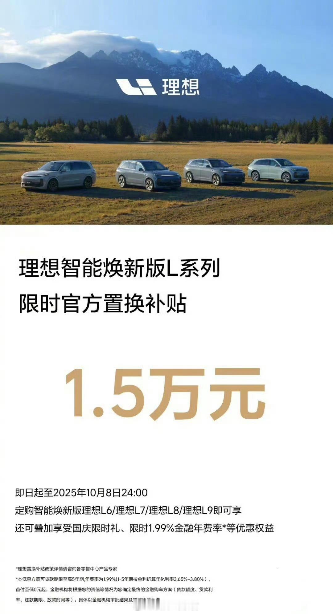 定购智能焕新版理想 L6 / L7 / L8 / L9 可享 1.5 万元置换补贴。