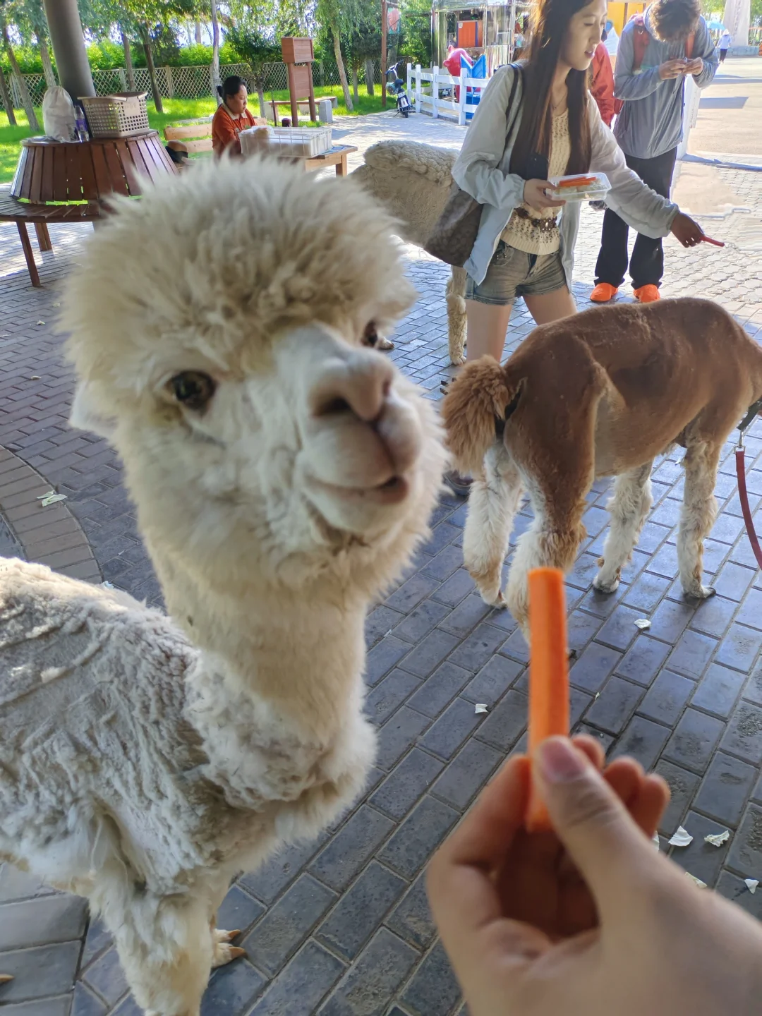 我记得我们刚到沙湖时,先是坐着游船来到了【萌宠乐园】,里面有很多可爱的小动物。在这里可以近距离和羊驼互动,我们一边举着胡萝卜给羊驼喂食,一边和它们拍照📸,非常有趣!