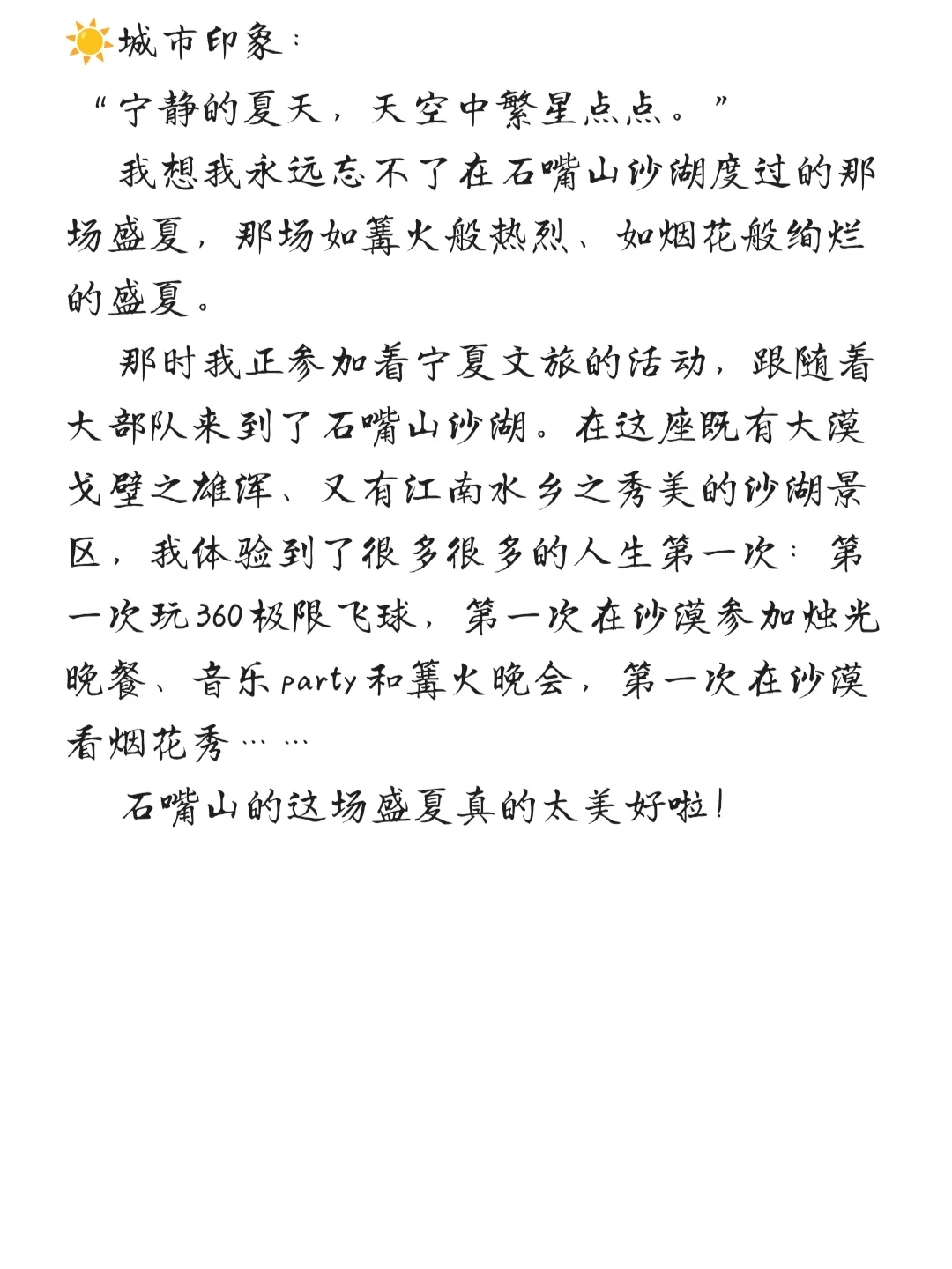 ☀️去年暑假参加了宁夏文旅的活动,跟着大部队来到了石嘴山沙湖。在这座“一半是沙一半是湖”的景区,我们度过了一场宁静热烈的盛夏。我永远忘不了,我们一群大学生在沙漠上吃着烛光晚餐、听着音乐party、围着篝火跳舞、看着烟花秀……真的太自由太美好啦!