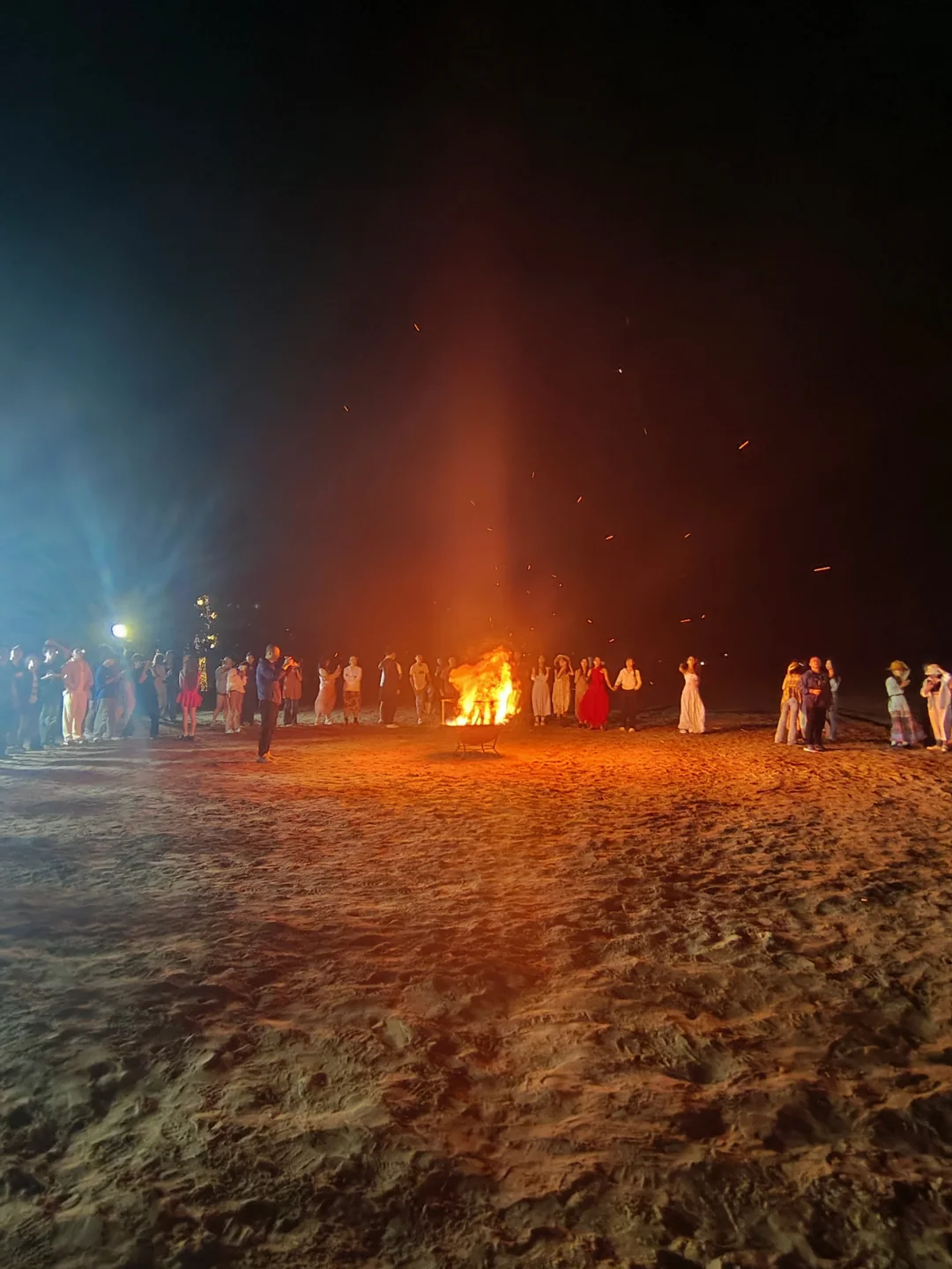 用完餐后,我们投入到今晚的重头戏中——篝火晚会。一群来自天南海北素不相识的大学生围在篝火旁,一起手拉手载歌载舞。温暖的火光映照着我们明媚的笑容,哪怕身处深夜的沙漠也不觉得寒冷。