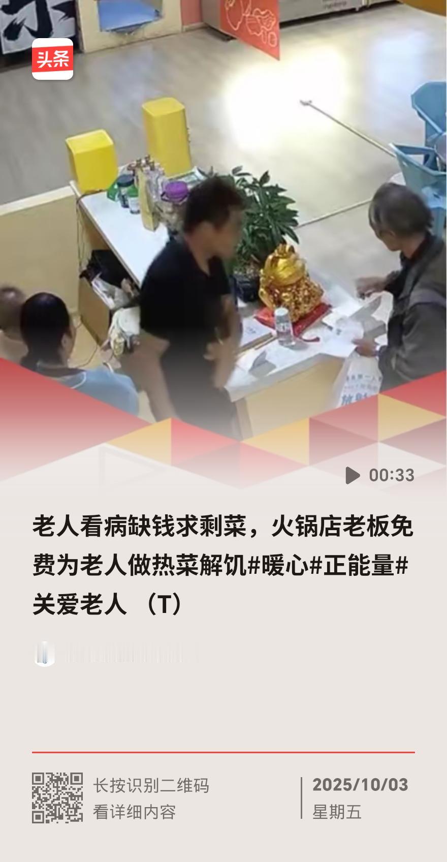 七旬翁持病历求剩菜 昭通店主免费供餐暖全网 云南昭通一饭馆近日上演暖心一幕。七旬老人攥着凉米饭进店,掏出病历、身份证甚至已故女儿的证件,只为证明“不是骗子”,求一份剩菜下饭。店主见状未多言,转身炒出回锅肉与青菜,还邀老人坐下热食,并承诺其看病期间可免费来吃两顿。 老人鞠躬致谢的画面传至网络,网友既心疼老人“自证清白”的窘迫,也赞店主的善意如冬日暖炉,护住了老人最后的体面。 我国60岁以上人口超2.6亿,类似困境并非个例。多地虽有“幸福餐厅”“以菜换饭票”等尝试,但部分老人仍因顾虑尊严或经济压力难享帮扶。 这场小饭馆里的善意,像一面镜子照出老年群体的需求——他们要的不只是饱腹的热饭,更是不被怀疑的尊重。若仅靠个体善意,难托千万老人的晚年。如何让制度保障与人性温暖并行,让更多老人不必“亮底牌”求一餐?这值得每个人深思。你遇过这样的暖心事吗?欢迎分享。昭通快餐店 昭通快餐店