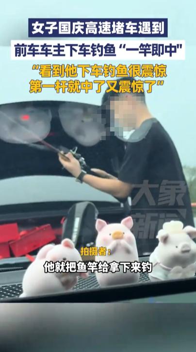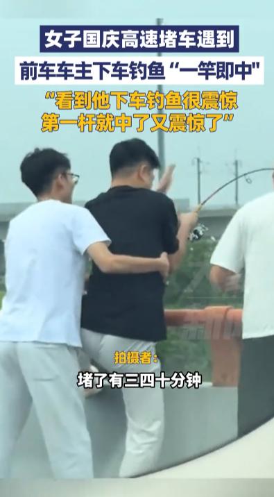 “离了个大谱!”10月1日,江苏常州,一男子国庆节开车出游被堵在高速上,见高速旁边有一处小河,他直接拿起鱼竿在路旁钓起鱼来,没想到男子“一杆即中”,收获了一条大鱼,网友:这车没白堵,多堵会吧! 十一长假期间高速免费,让不少人选择自驾出门旅游,一到这个时候高速上就开始大堵车,这一堵可能就是几个小时,让人十分煎熬,有的司机就会自己下车找点“乐子”。 一男子十一假期开车和朋友出行,不出意外,他被堵在了高速上三四十分钟,看着前面排成长龙的车辆,自己的车一时半会也动不了,男子急坏了。 正着急时,男子突然注意到高速下面有一处小河,二话不说直接下车取出后备箱的渔具,开始和朋友在高速旁钓起鱼来,没想到才刚甩下去第一杆,就有条大鱼上钩了,在朋友的帮助下,男子硬生生将这条大鱼拉了上来。 这一幕让后面的车主都看傻了眼,要知道在高速上钓鱼已经够离谱了,还一杆即中,这运气得多好,后车司机用手机将男子钓鱼的过程记录了下来,觉得很有趣便发在了网上。 不少网友认为男子这车没白堵,估计再堵一会都能到水产市场摆摊了,这段高速钓鱼的经历绝对够让男子在钓友群里吹上半年了! 信息来源:《女子国庆高速堵车遇到前车车主,下车钓鱼“一竿即中",“看到他下车钓鱼很震惊,第一杆就中了又震惊了”》大象新闻