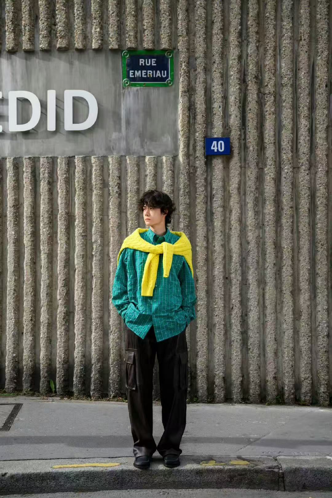 王一博绿衬衫黄披肩造型 潮男出街~王一博这一套太吸睛啦!