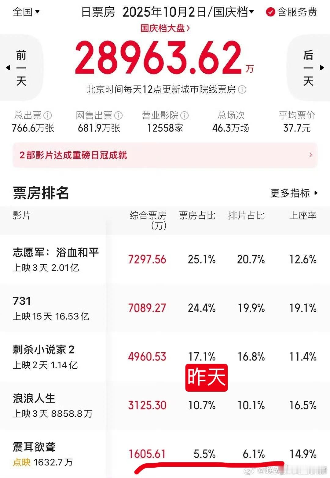 震耳欲聋明天就正式上映了,今天点映第二天逆跌了,这部口碑稳稳的,只要保证排片就👌 ​​​