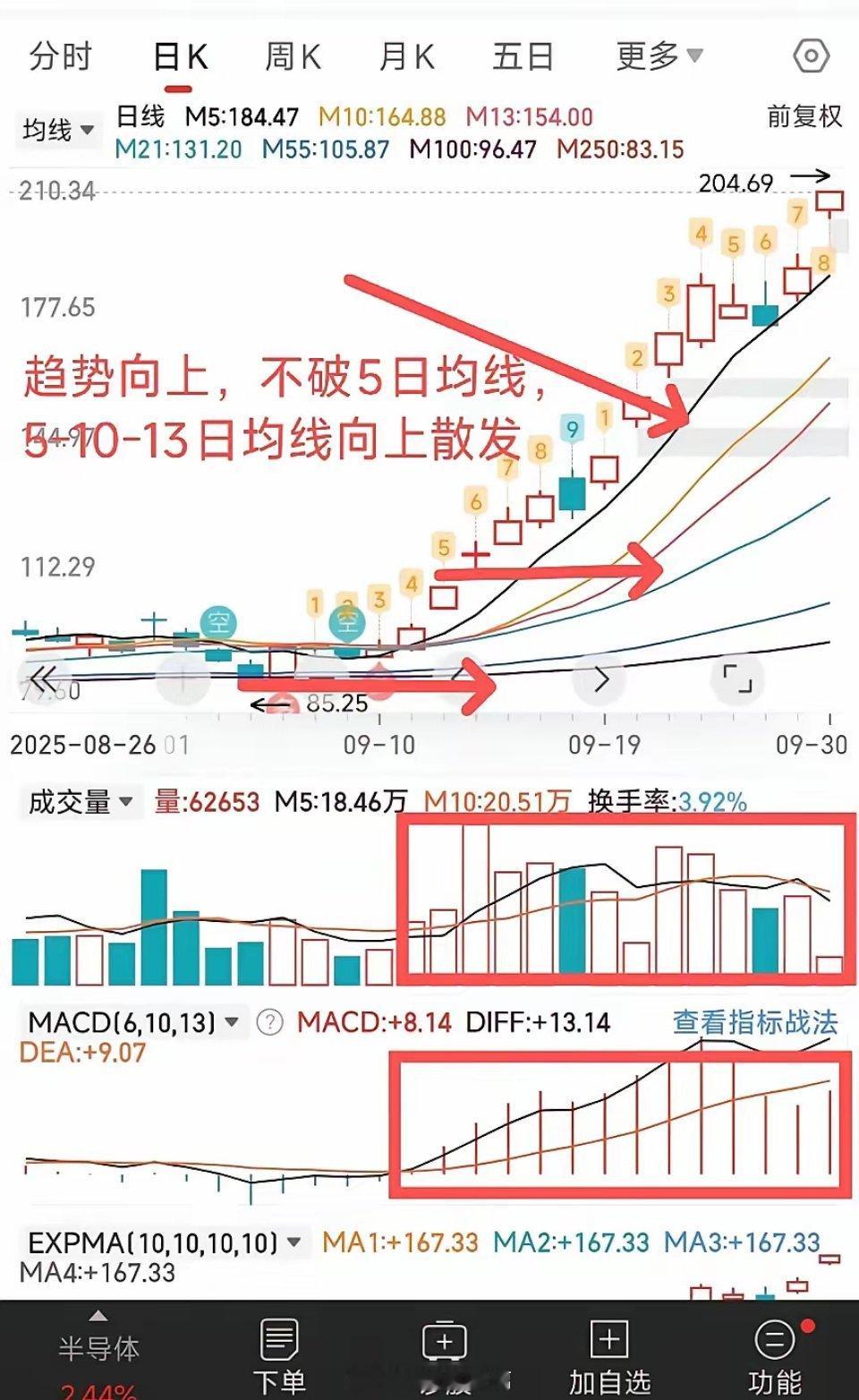 这只前期出现一个涨停,然后回调都没有跌破5日均线,趋势向上通道,5-10-13日均线你没有背离太远,都在5日均线上方,回调也都是小阳线,阴线回调也是缩量回调,经常高开高走,板块半导体。非常适合做长线,市值300多亿。现在200股价了,涨了一倍。不建议进场了。