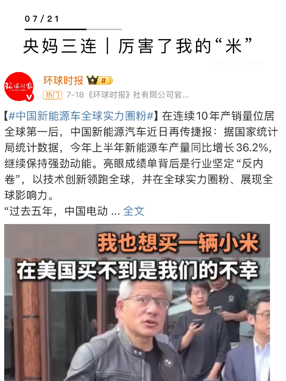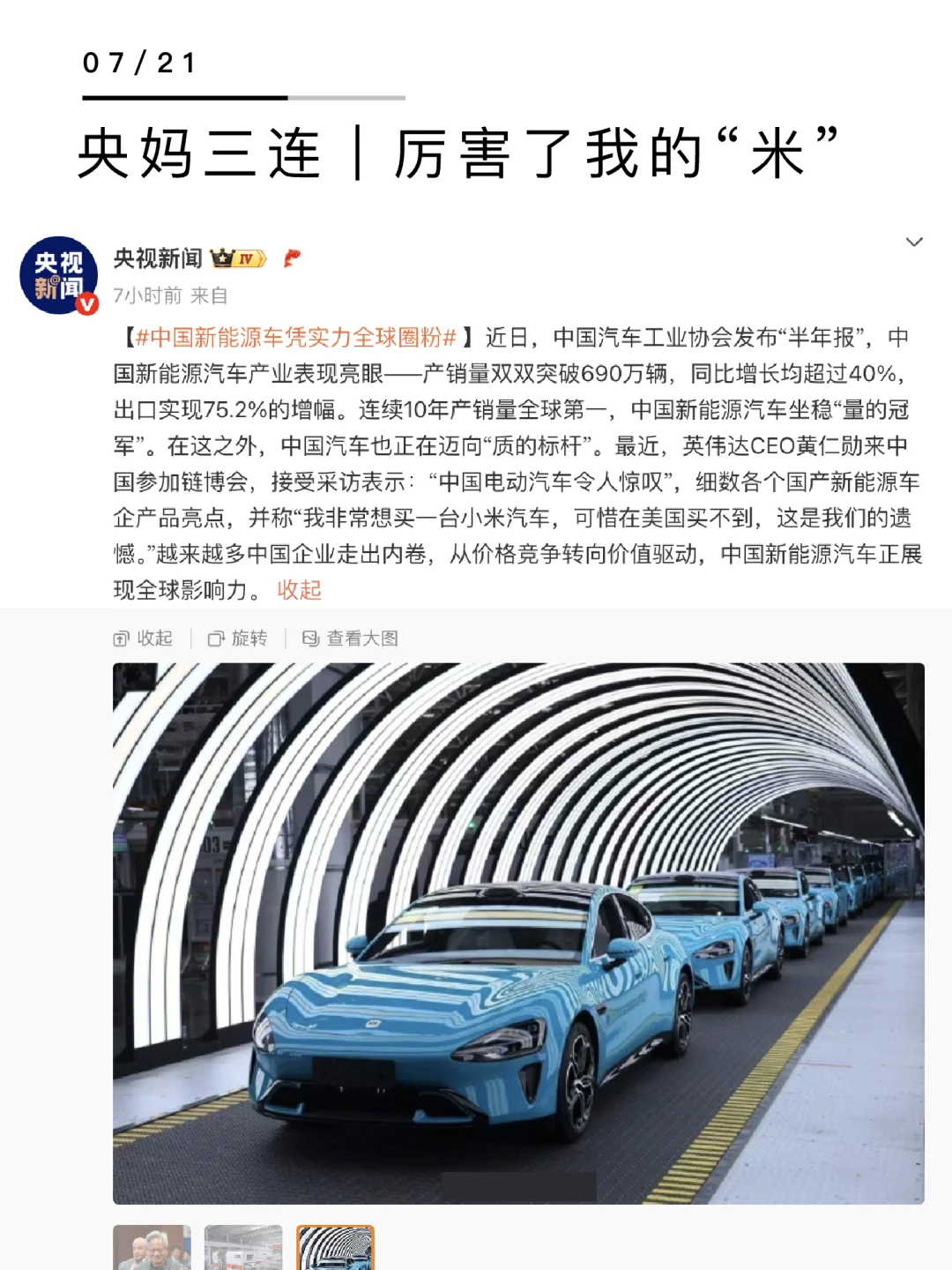 说起来,这段时间,小米汽车的名字频繁出现在央视镜头里,从纽北赛道到24小时耐力赛,再到英伟达黄仁勋的评价,央妈已经连续三次“盖章认可”。这也说明了,当中国制造在海外不再只是“便宜”,而是“厉害”的代名词,小米SU7就是那个标志性拐点。