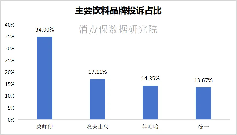 主要饮料品牌相关投诉中,康师傅、农夫山泉、娃哈哈的投诉量位居行业前三。