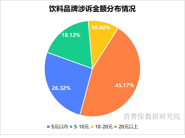 主要饮料品牌相关投诉中,涉诉金额在20元以上的投诉量占比45.17%;其次是金额在5元以内的投诉量,占比26.32%;涉诉金额在5-10元的占比18.12%,10-20元的占比10.40%。