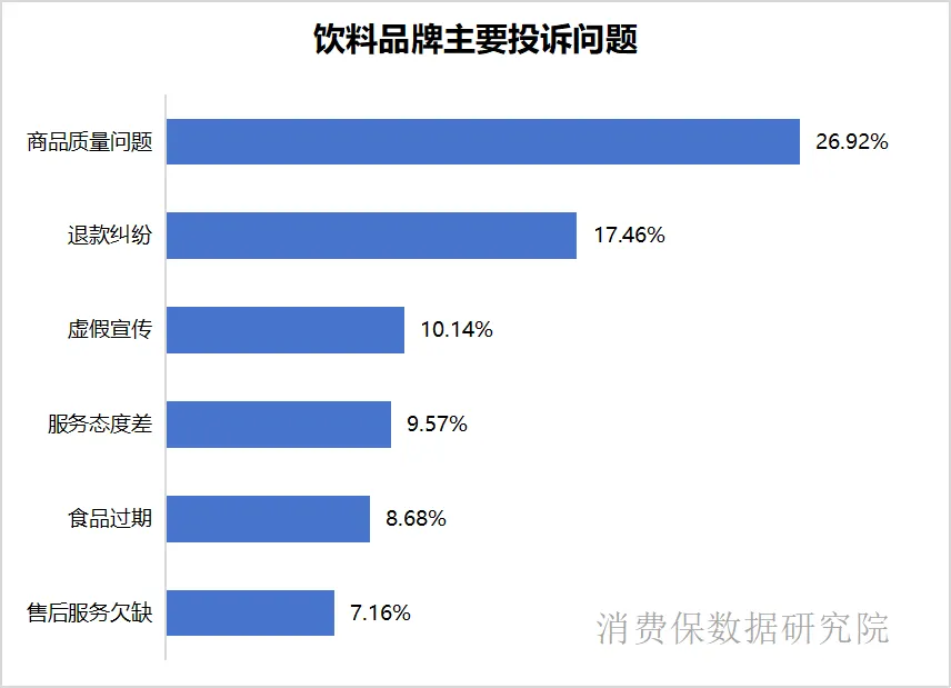据统计,饮料品牌相关投诉主要投诉问题集中商品质量问题、退款纠纷、虚假宣传、服务态度差等方面。其中,商品质量问题占比高达26.92%;退款纠纷次之,占比为17.46%。