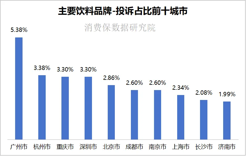 根据地域数据显示,饮料品牌相关投诉中,广州市的用户投诉量位居第一,占总投诉量的5.38%;杭州市排第二,占比3.38%。