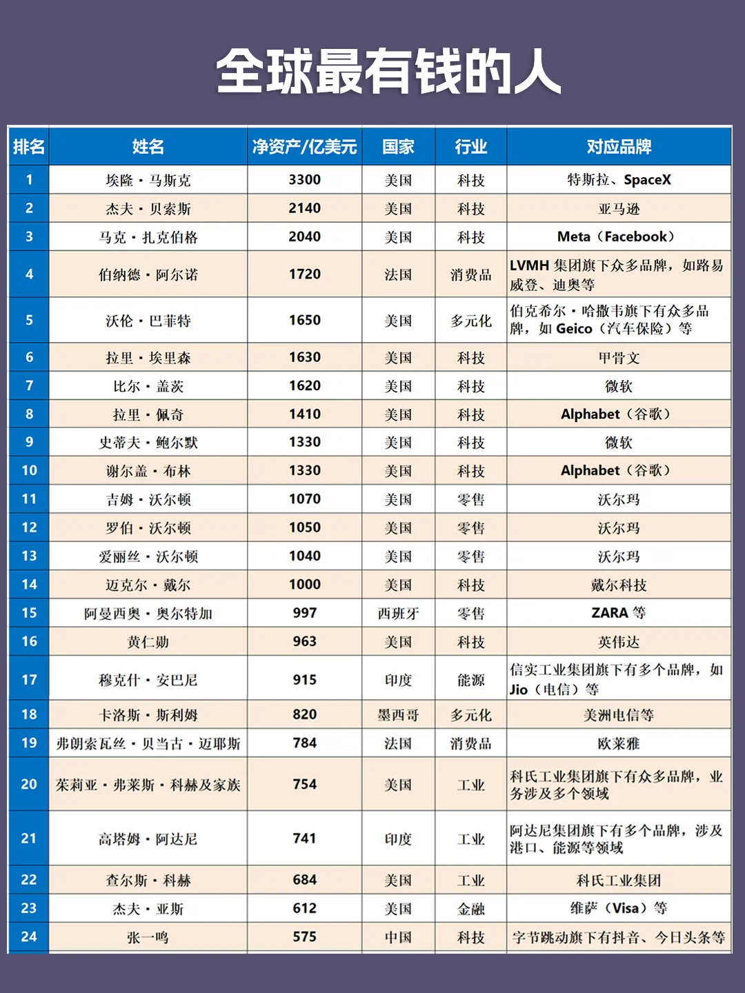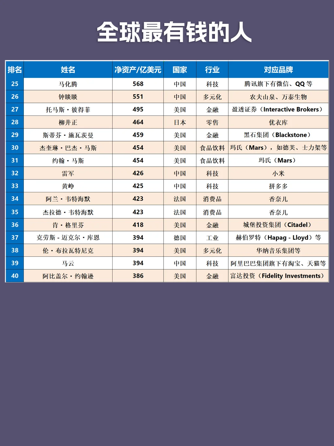 福布斯实时亿万富豪榜中全球最有钱的前 40 名👇